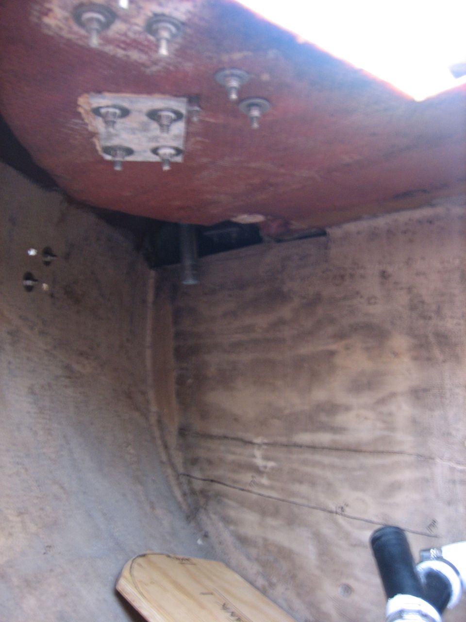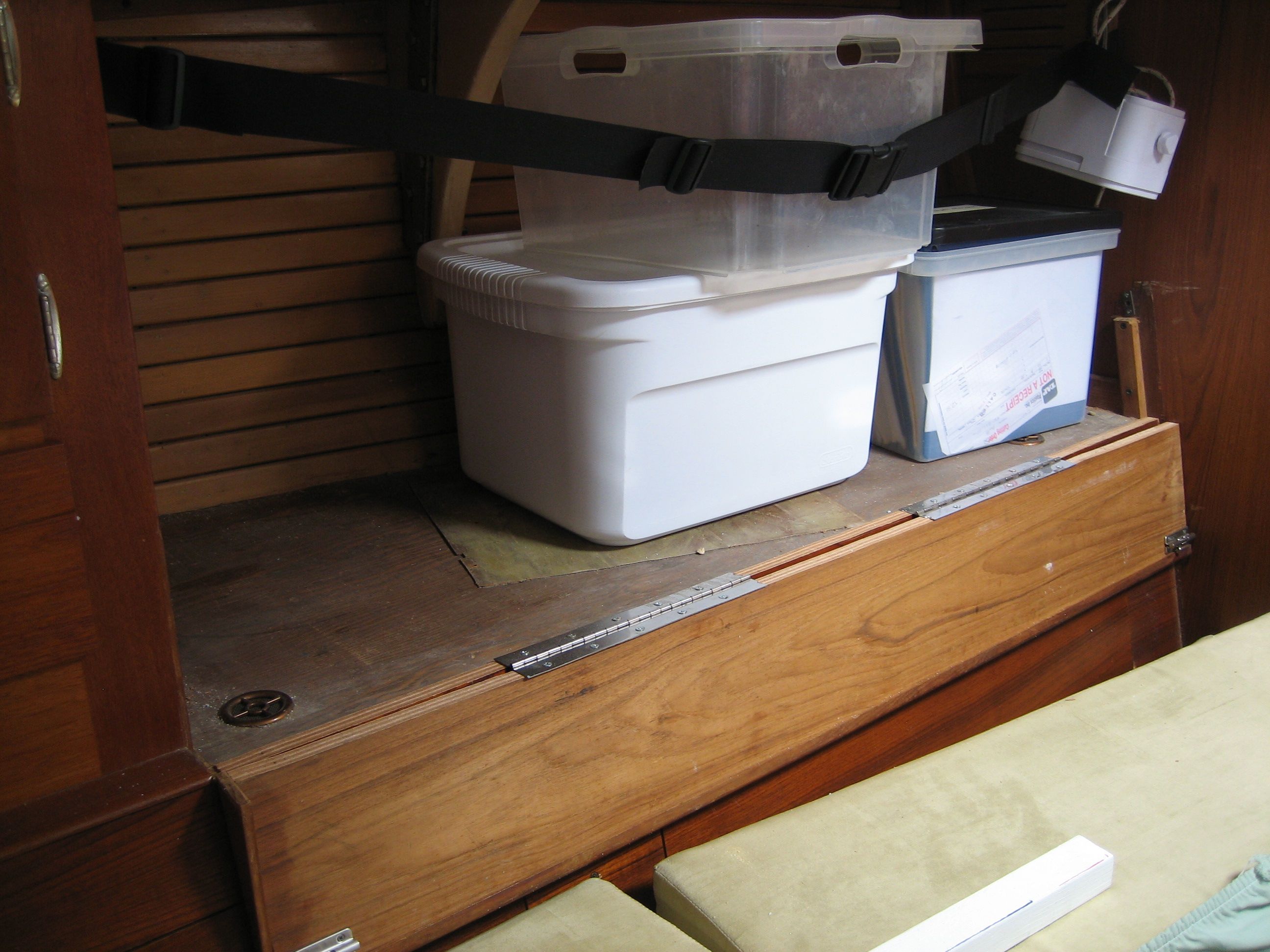 This was a problem of our own making. First we painted the bilge, including the edges against which the cabin sole board edges rest, which reduced the clearance enough to make it difficult to get the boards in and out. Then we sanded the edges down to make them fit. Then the raw wood on the edges, which we didn’t treat with anything, absorbed water and swelled, making it even harder to get them in and out.