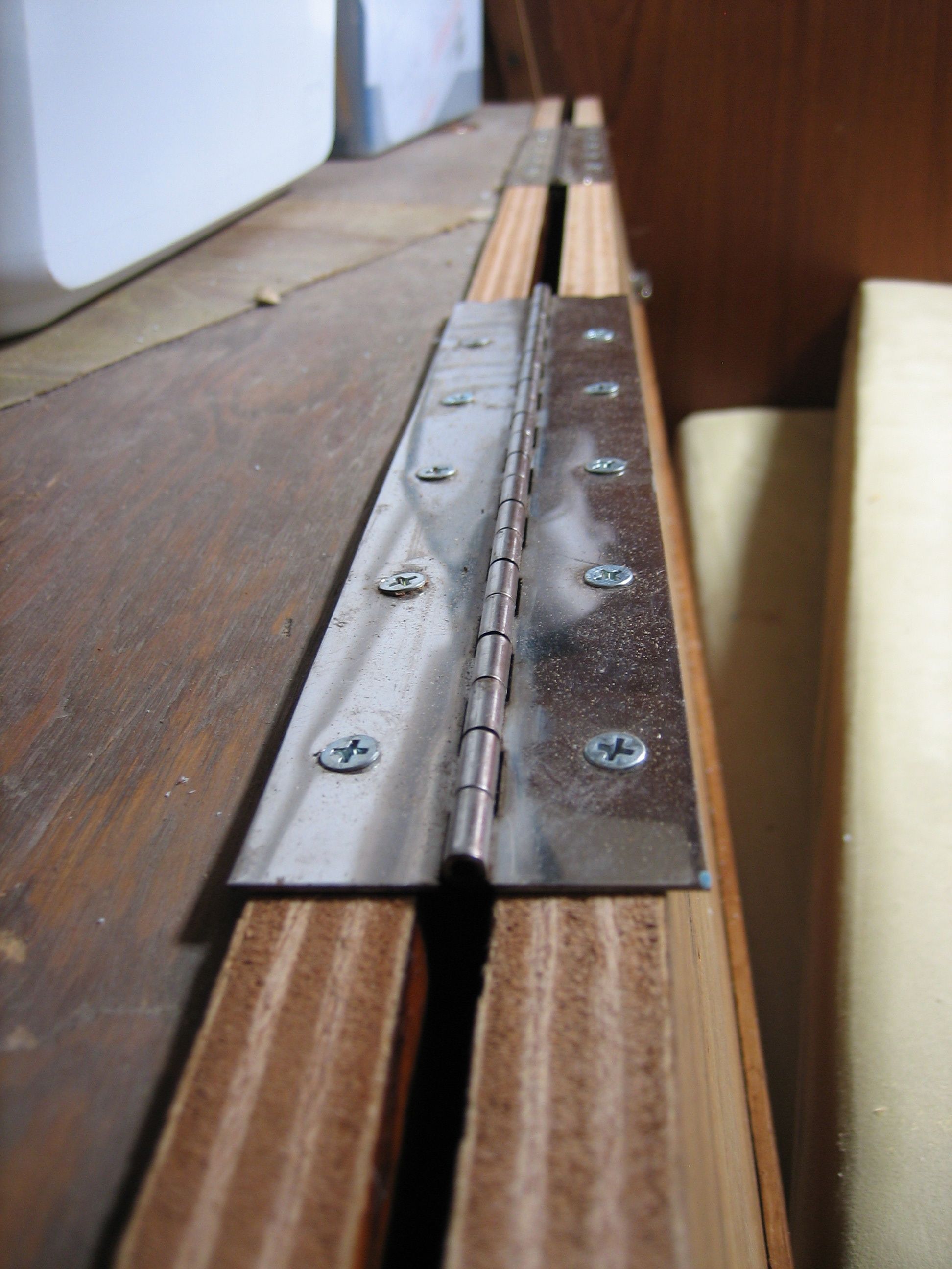 we used piano hinges scrounged from dismantling old table