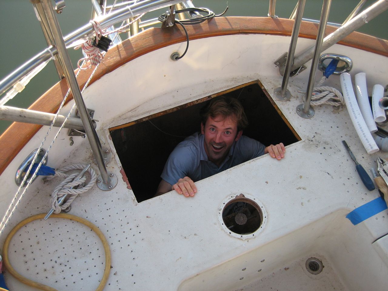 We decided to remove the old propane locker, build a new one tucked into the corner as much as possible, and put flush fitting hatches over the lazarette and propane locker. The job ended up being the biggest so far undertaken on the boat, and isn’t yet finished. Of the many unforeseen hurdles, we discovered that we needed to move and/or reroute all three of the scupper drains on the port side, to accomodate the new propane locker (not to mention close the old propane drain and install a new one). So this job alone required 4 new through-hulls and two new scupper drains on deck.