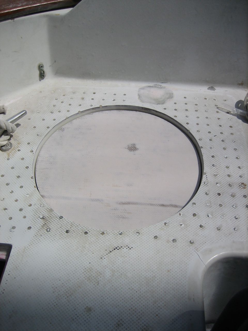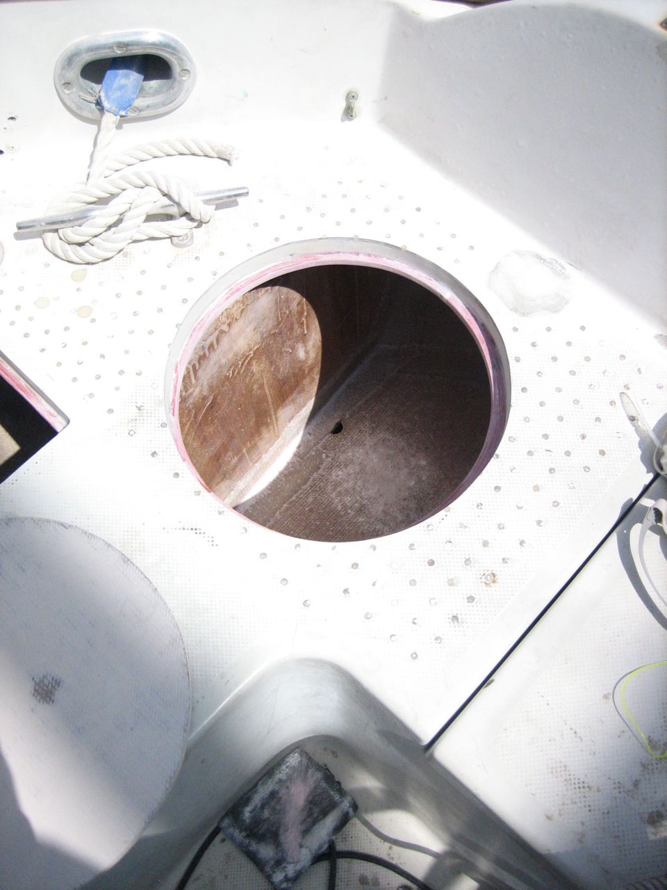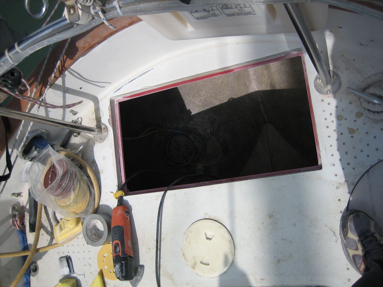 Additionally, the deck just forward of the propane locker, especially around the rudder access hatch, was extensively delaminated (core was perceptibly soggy, damp, and black). Jonny elected to dig out the core from the hatch and rudder post hole (i.e. without removing the top or bottom layer of fiberglass), and ended up removing the core to a distance of close to a foot in the space forward of the new lazarette hatch (there are some pictures of it). Then he carefully measured and cut a few pieces of plywood that he buttered with epoxy and then shoved into the gap. Afterwards there were some gaps left in the core where the plywood didn’t quite reach that I injected with resin, per the usual method (drill holes for the syringe, inject resin until it splooges out all over, let it cure, sand off the puddles of resin, quikfair the remaining divets, sand again).