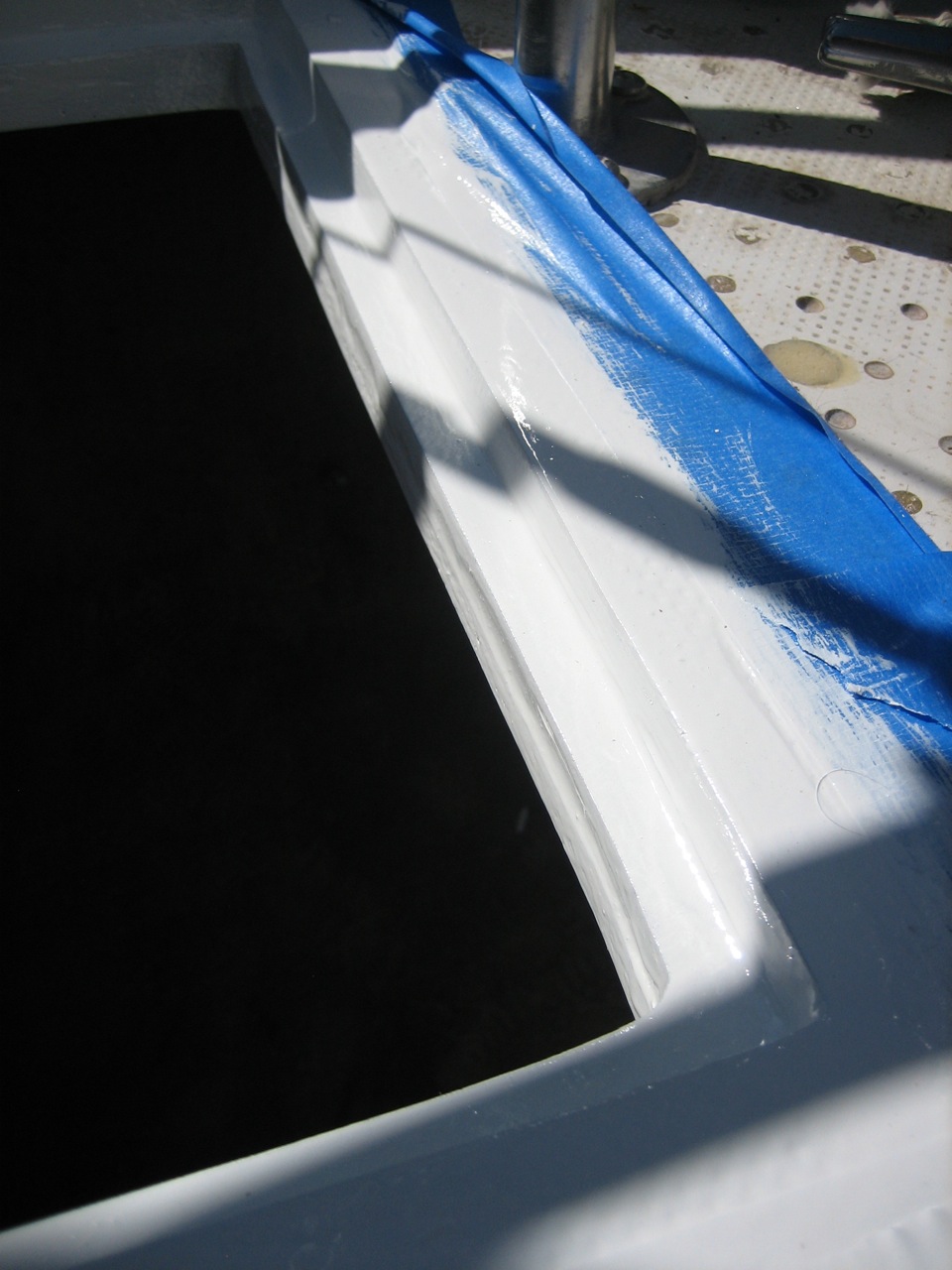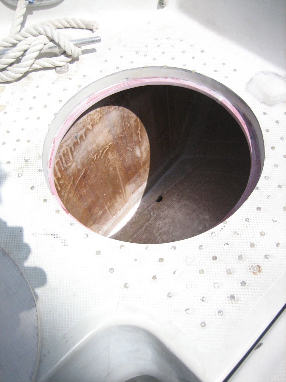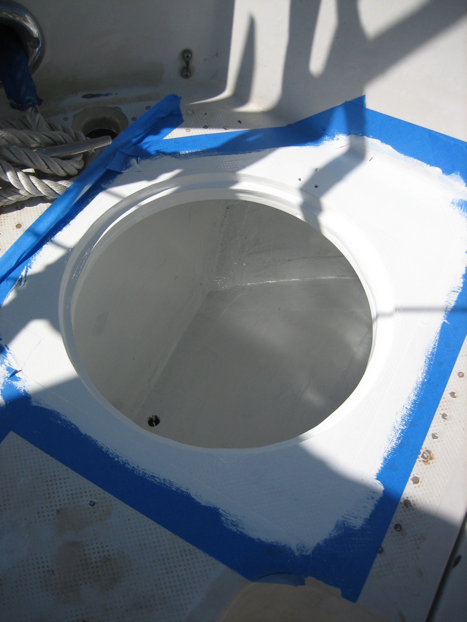 Additionally, the deck just forward of the propane locker, especially around the rudder access hatch, was extensively delaminated (core was perceptibly soggy, damp, and black). Jonny elected to dig out the core from the hatch and rudder post hole (i.e. without removing the top or bottom layer of fiberglass), and ended up removing the core to a distance of close to a foot in the space forward of the new lazarette hatch (there are some pictures of it). Then he carefully measured and cut a few pieces of plywood that he buttered with epoxy and then shoved into the gap. Afterwards there were some gaps left in the core where the plywood didn’t quite reach that I injected with resin, per the usual method (drill holes for the syringe, inject resin until it splooges out all over, let it cure, sand off the puddles of resin, quikfair the remaining divets, sand again).