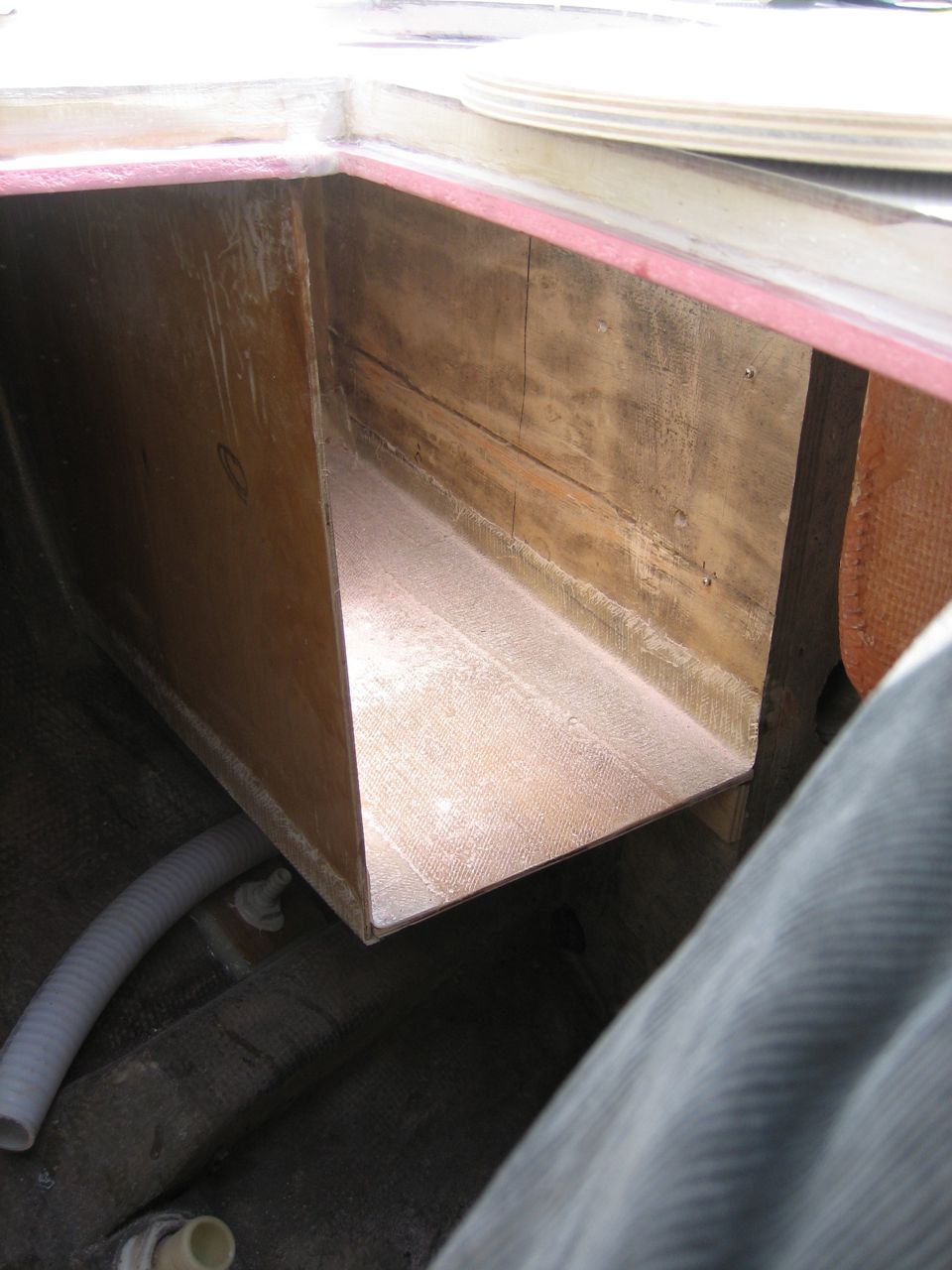 Jonny painstakingly glassed the box in place using strips of knytex–the box was odd shaped to accomodate the curves of the hull and the deck/coaming/toerail ceiling section.