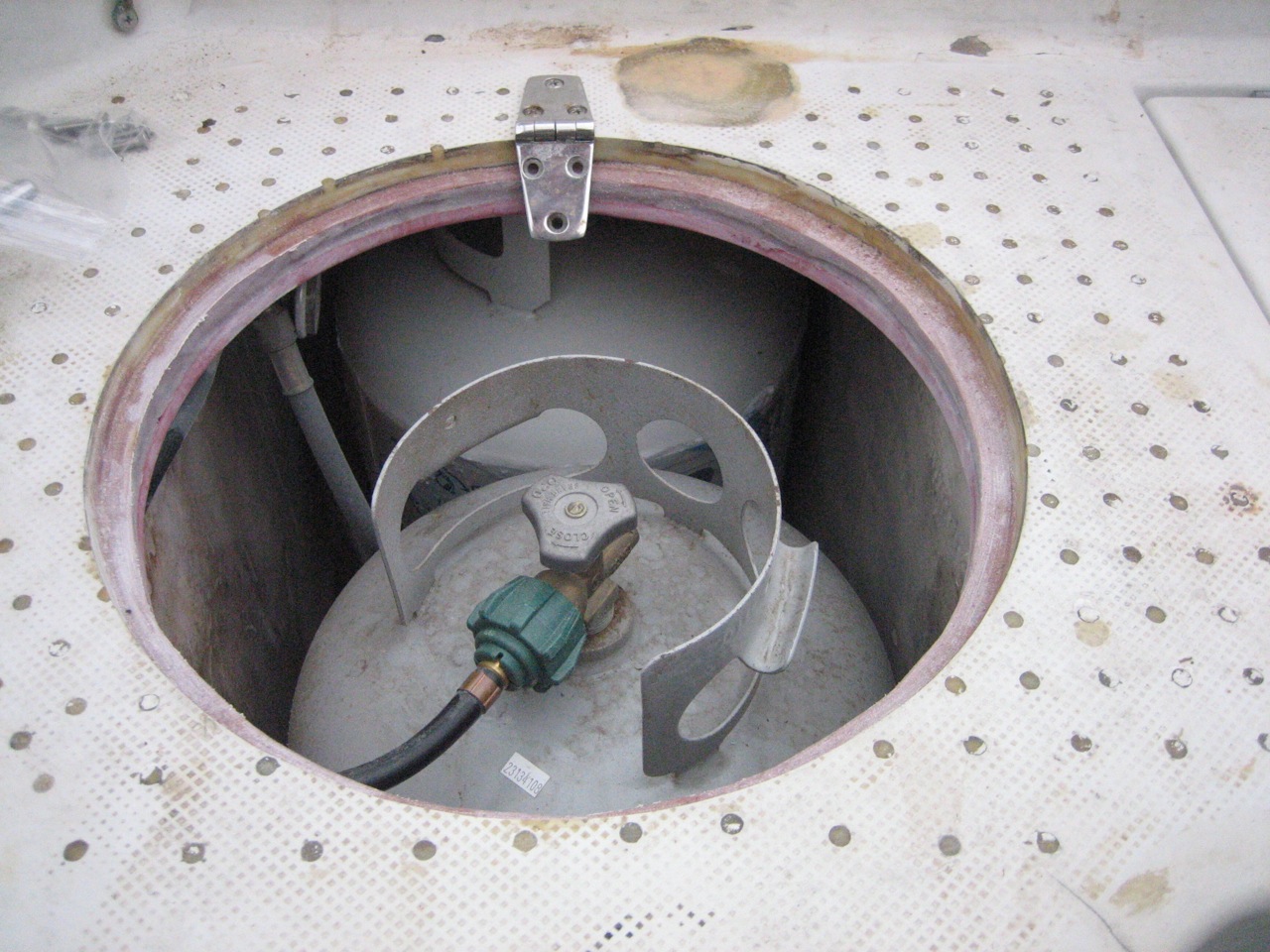 The old propane locker was a fiberglass box mounted in the middle of the stern. It protruded 5″ above the level of the seat, and was suspended in the enormous space of the lazarette, rendering the space unusable and the seat unseatable.