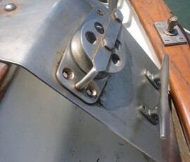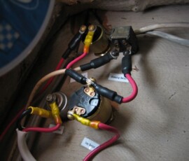 This was a hell of a job. First I’ll describe the original state of the panel. The panel was set back 4 inches in the space, behind a 3 inch vertical piece of trim. The panel was hinged at the bottom, so that when it folds down it hits the piece of trim, preventing it from opening less than halfway. Inside the panel, all of the negative wiring was piled up on a single stud, with over 16 terminals stacked on top of each other, all corroding. A handful of wires had pulled out of the terminals and were hanging loose in the compartment, only a few inches away from the hot stud. It was unorganized, impossible to access and work on it, and a serious fire hazard. I took out the old panel and cut out the trim so that the new panel could be mounted at the face of the compartment (rather than 4″ recessed). I constructed a new panel out of plexiglass from TAP plastics, laboriously drilling all the holes to accomodate the circuit breakers. I put a piece of hardwood trip around the outside (coated with penetrating epoxy) and used a long piano hinge to mount it. I used all of the old breakers from the old panel. To make the common, hot side of the circuit breakers, I bought a strip of solid copper from McmasterCarr, and drilled out holes to match the location of the circuit breakers. I bought tiny little screws from bowline and screwed the common hot side of each breaker flat against the copper bus bar. I ran 0 gauge hot and negative cables to the compartment, mounting all the negative to the right and all the hot to the left. The 0 gauge hot supply runs to a stud, and 3-4 gauge jumper cables connect from this stud to each of the copper bus bars on the back of the panel (there are three rows of breakers). I mounted three terminal blocks on the left side of the compartment, to mirror the three rows of circuit breakers. I used short jumpers of 12 gauge wire in as many different colors as I could find to make the connections from the circuit breakers to the terminal blocks. These short jumpers are bundled into spiral wrap to tame them. All of the negative wiring runs to a dedicated spot (very few stacked terminals) on two ample sized negative bus bars. The wiring remains loose in the compartment behind the panel, and looks completely disorganized. But there’s plenty of space and it is simple to trace wiring. I am concerned that if I bundle the wiring all up to make it look pretty, it will only make it more difficult to trace wiring.