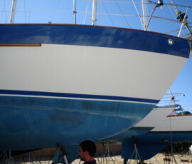 Our keel is half lead, half foam. The front half is lead, the aft half foam. The problem with this is that the join between the two is apt to crack–the keel flexes, the yard sets it down on the foam, maybe even just sailing it, whatever did it, it cracked on us and was admitting/weeping water. (Sometime after our hull number, uniflite wised up and started making the bottom half lead, top half foam.) Down in mexico, I drilled a ton of holes into the foam, bottom and sides, in order to drain the water that was living in there. I also ground down the join so it could dry out. Also, the “smile” at the top front of the keel was weeping slightly from a crack in what I believe was the fairing compound they used. I ground this down in anticipation of drying it out and glassing over it also. In the Berkeley workyard we injected epoxy into the holes I had drilled to repair the mild delamination. Then we used knytex fiberglass fabric to glass over the join (many layers–I had gone a little overboard with the grinding). We glassed over the “smile” the same way. Then we ground down/sanded down the fiberglass fair with the hull. Then we used Quikfair (two-part epoxy fairing compound) to fair the areas smooth. Then we sanded these down fair. Then it was ready for priming before bottom painting.