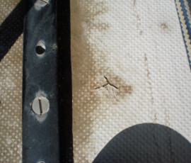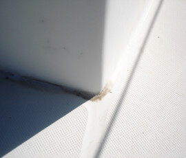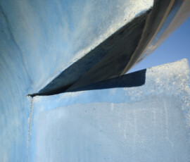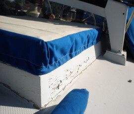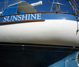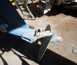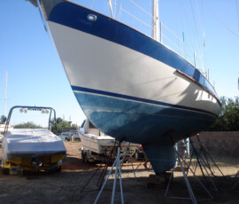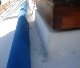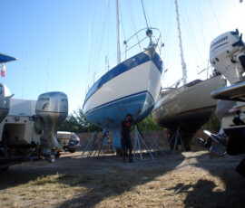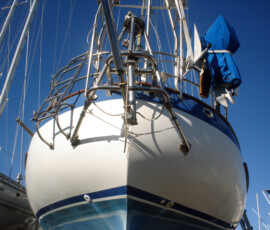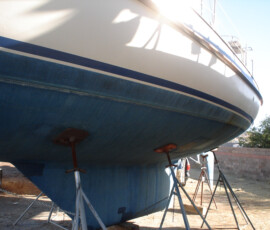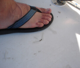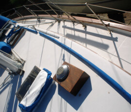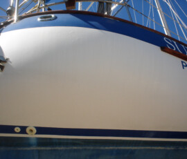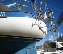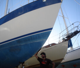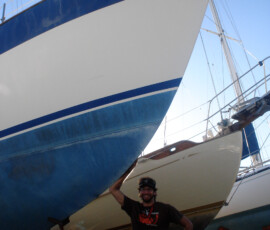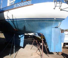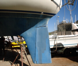 Our rudder delaminated (fiberglass pulled away from the foam) very slightly, no more than 1/8″, from sitting in the mexican desert where the sun would expand and contract it every day. I know that it happened there, because the yard workers repaired it and it sat for awhile without sailing, and it delaminated again while sitting there. The only really important issue is whether there is water in the rudder that is corroding and rotting away the internal metal structure. If that happens, the metal tabs inside can break off and you can lose your steering–which would be very bad indeed. There was no water in our rudder (well okay like two drops) so the delamination that we had wasn’t very alarming. But we repaired it anyway. We drilled holes and injected epoxy using a syringe, then filled the holes with thickened epoxy, and then eventually sanded these fair before priming and bottom painting.