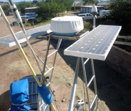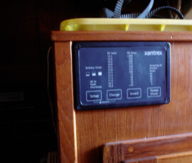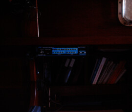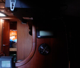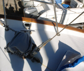 We purchased a FirstStar LED trilight bulb, which is conveniently a light-activated anchor light and trilight all in one bulb that fits a standard socket (only two conductors needed; switch the polarity to switch the function). Our old masthead housing wasn’t a standard socket, and was nearly opaque besides. We replaced it with a standard Aqua Signal series 80 fixture. But we weren’t happy with how low the housing sat–the visibility was blocked by other mast hardware. So jonny bought some c-board and we mounted the fixture atop four stacked 1″ pieces of c-board. I even routed the wire through the c-board to come up exactly underneath the fixture, to avoid water intrusion. We’re very proud of the result.