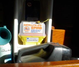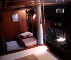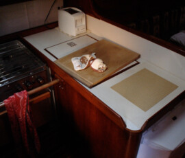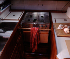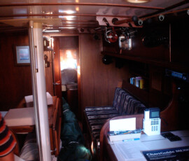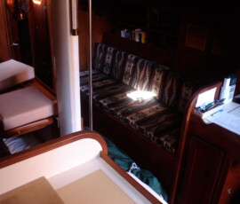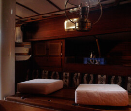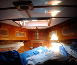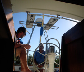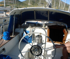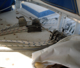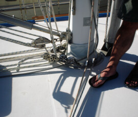 In the cockpit, we installed two padeyes behind the starboard seat to run a jackline, so that you can clip in before leaving the companionway, and stay comfortably clipped in while hanging out in the cockpit.