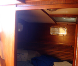 Our idea is to replace the stainless tanks with our own home-built West System plywood/epoxy tanks. We have 150gallons of tankage; if we had less I would have elected to use Ronco plastic tanks, but they don’t make ones near big enough and I didn’t want complicated plumbing stringing multiple tanks together. The watertanks are bolted to the hull in two places on the backside of the tank (each one), via a machine screw to fiberglass stringers. The tanks were installed in the boat and the settees and storage were built around them, so it is necessary to cut out access hatches through the bottom of the storage compartments behind the settee. We determined where to cut these access hatches by using a mirror and a yardstick to estimate the location of each stringer. I really really hate having to cut new holes in the boat, but in this case it truly was unavoidable. The tanks are not identically sized; the starboard tank is slightly smaller. We were able to take the starboard tank out the companionway–it was a very tight fit. After that sigh of relief, we were extremely dismayed to discover that the port tank is larger and definitely doesn’t fit. We went back and forth trying to decide whether we should tear about the companionway trim or cut up the tank. We weren’t sure we’d be able to get the tank out even if we ripped out all the trim, so we elected to cut the tank up down below. This proved to be an epic task, and that’s an understatement.