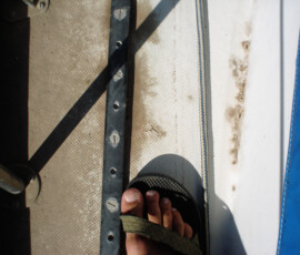Webbing is nice for jacklines because it doesn’t roll under the feet. But it degrades in the sun and the strength goes to shit. Somewhere I read a good idea–thread line down through the center of the tubular webbing and have the advantages of both. So that’s what we did. I bought blue 1″ tubular webbing and 1/4″ amsteel, and jonny did the deed of threading the amsteel through the 40ft lengths of webbing. We made our own tethers by threading shockcord through tubular webbing; one end gets a trigger release snap-shackle (that will be the pfd side) and the other end, a steel biner. These things retail for $100 or so; ours were much cheaper.