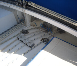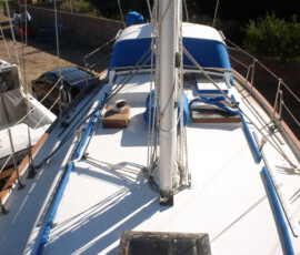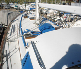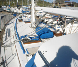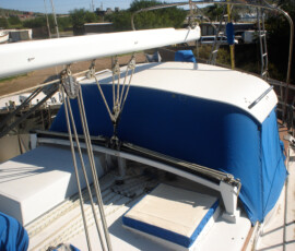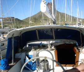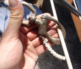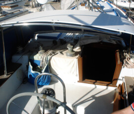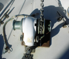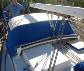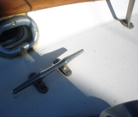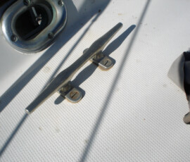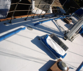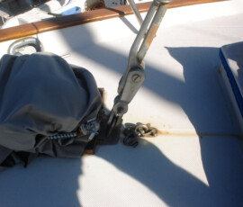 When we had it trucked up from Mexico we removed the bow pulpit for 14′ clearance. In doing so, we discovered that the stainless bolts were inextricably locked to the aluminum (?) backing plates (which were 50% gone from corrosion, especially the ones in the anchor locker). So we ground off the heads of the bolts on deck, leaving the issue for the Berkeley workyard.