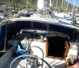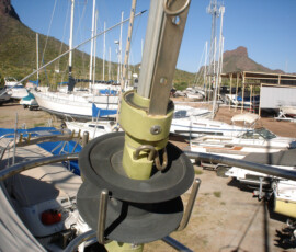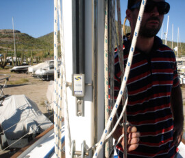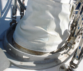 We redid everything except the backstay, which had been replaced in 2005 with a rod. The backstay was in great condition, and was already setup with the ssb insulators, so we felt it would be silly to replace a perfectly good rod. We used 316 stainless 1×19 wire, in two diameters: 3/8″ for the forestay and uppers, 5/16″ for the lowers, the babystay, and the intermediate backstays. We used norseman fittings, top and bottom, so that we could do everything ourselves. We measured from scratch, so to speak–from the hole in the tangs to the holes in the chainplate. Then we subtracted an amount for the upper terminal, the lower terminal, and the turnbuckle in order to determine what length to cut the wire. We cut the wire using a diamond blade on a dremel tool. This works just fine, but is slow. If you have a grinder, get a thin cutoff blade for it and use that (by the end we got around to doing it this way). We did all of this in the living room at our old place, 2,000 miles away from the boat, hoping that our measurements were all correct (we wanted to have it all ready to go when the boat arrived in the workyard, to minimize yard expenses). Here is our final spreadsheet of numbers. I decided on this plan using Brion Toss’s “Rigging Apprentice”. I used his numbers for constructional stretch as well. Like many do-it-yourself minded cruisers, we are much indebted to Toss for passing on his knowledge. When we restepped the mast, we discovered with delight that our measurements were spot on–each turnbuckle is now extended slightly more than halfway, which allows for some additional stretch and some tightening when we do a final tuning of the rig. Instead of using cotter pins to lock off the turnbuckles, we put a small machine screw through each hole with a nylok nut–it’s way faster to remove the nuts and pull out the machine screw than to bend the cotter pin back and pull it out–and the machine screws don’t cut and rip things like the cotter pins do.