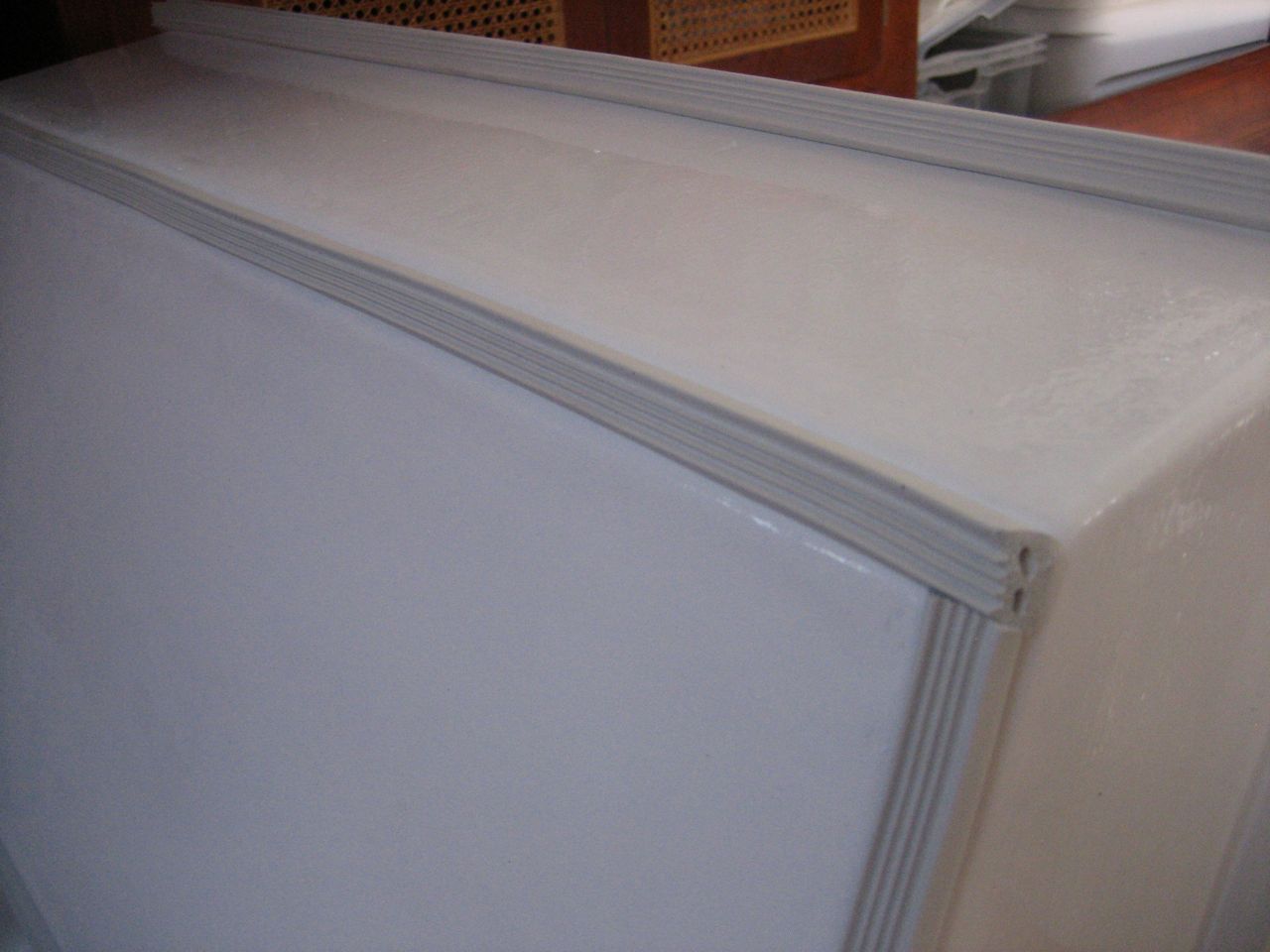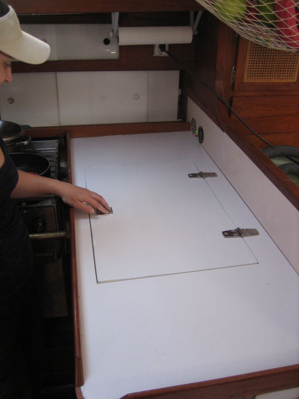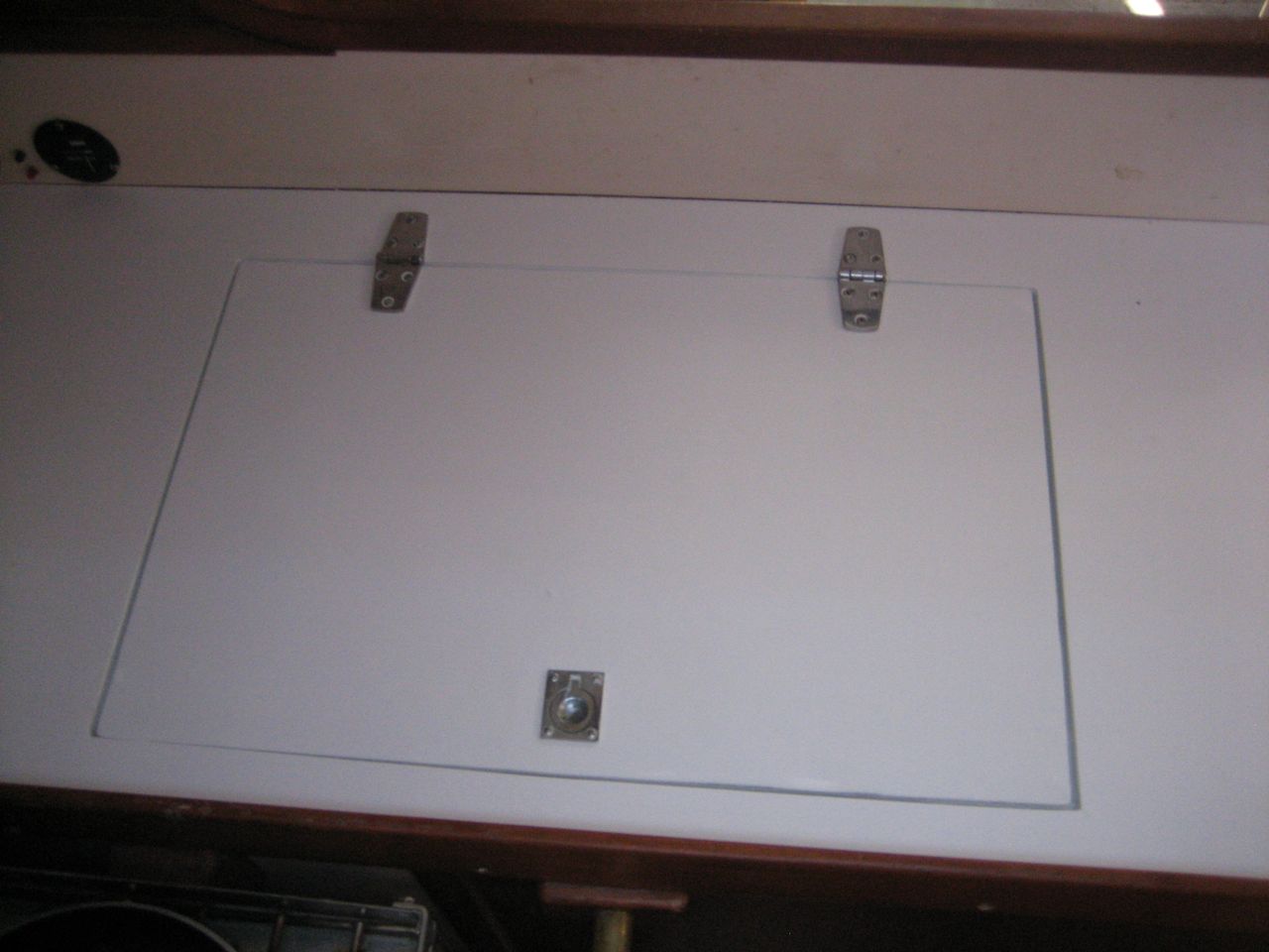 Built a platform and mounted the compressor, and built/faired the lid for the box. Glued down formica laminate, then painted with two coats of Primekote, sanding in between. Almost finished, just have to put on the two coats of Interlux Perfection, mount a ring pull in the lid, then seal down the hinges and run a bead of caulk around the countertop.