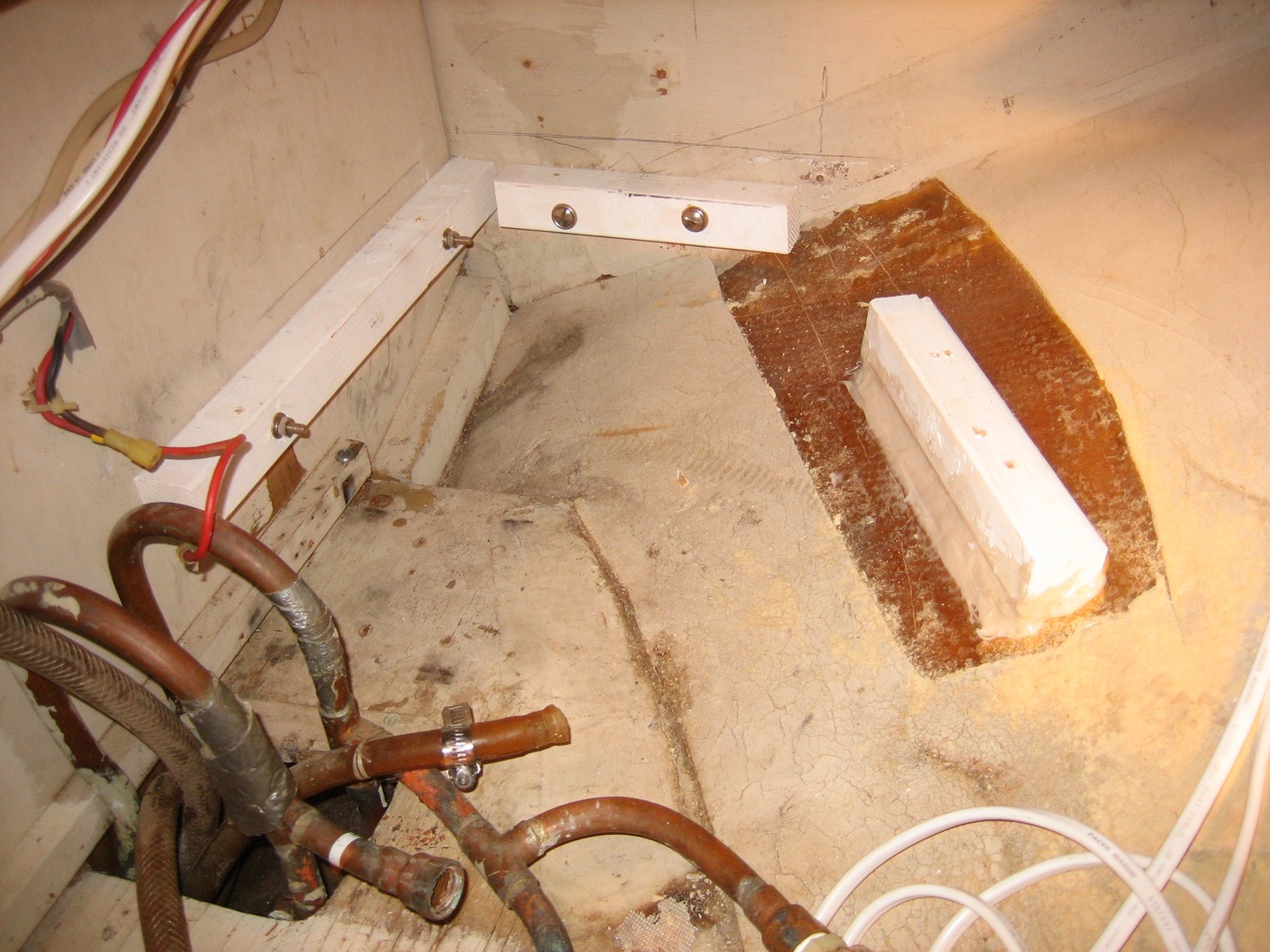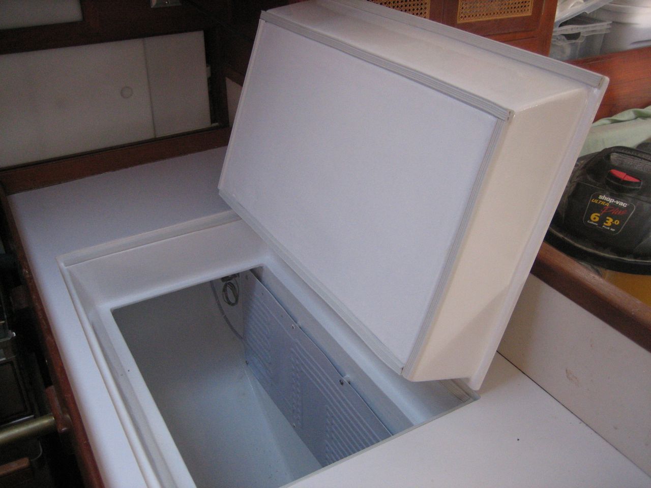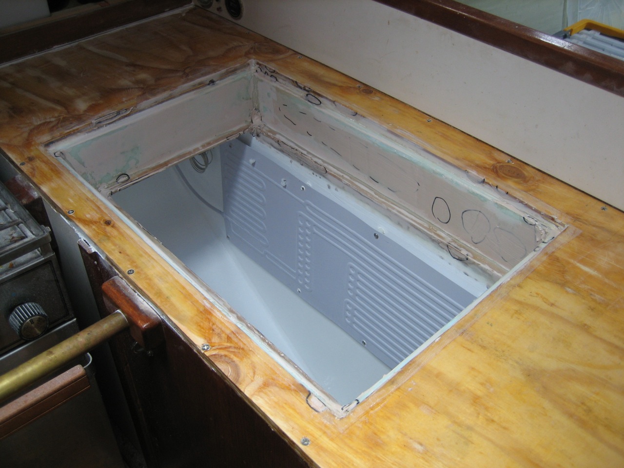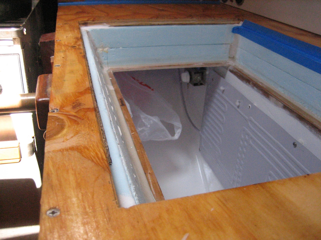 Our compressor was kicking on and off erratically for a period of probably 6 months after we started using the boat. Each time it stopped working, jonny would lose a bunch of food that went bad in the icebox, and then he would have to clean it out when it started smelling, etc. Finally we gave up and Jonny has been living without refrigeration for 6 months now. Also, I decided from my research that the insulation in our box was inadequate: 1) it’s 30 years old (it deteriorates big time in r-value) 2) there was 1.5″ on the top and 3″ on the rest of the box; there should be at least 4″.