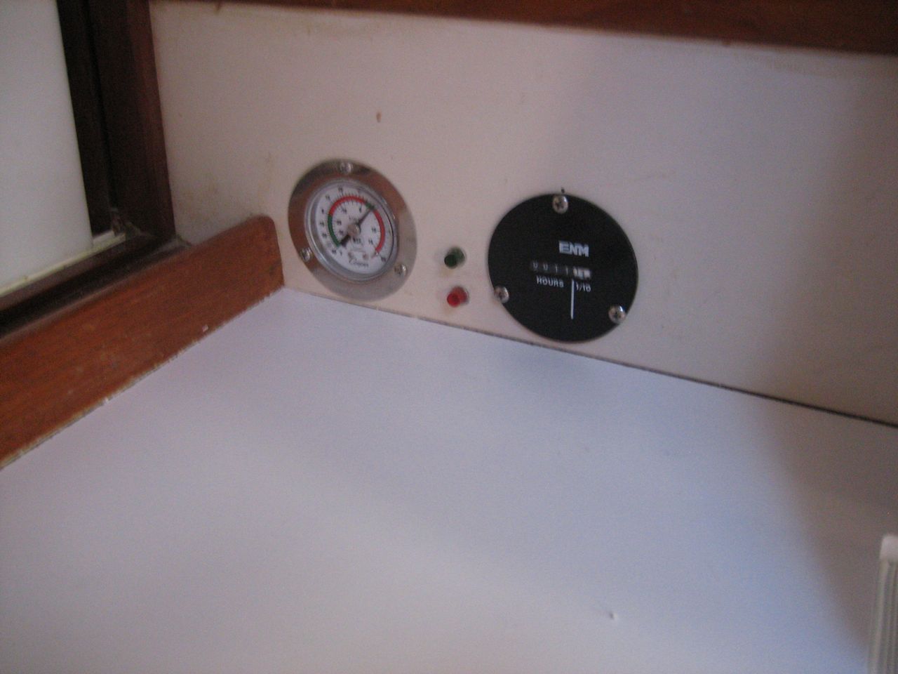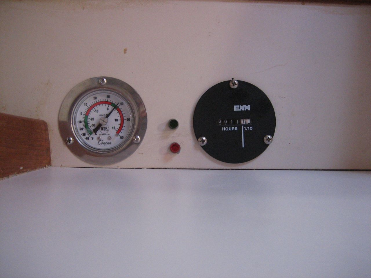I installed gauges in the countertop above the icebox: a thermometer (convenient to have one outside the fridge so you don’t have to open the box to check), a green LED that lights up whenever the compressor is running, a red LED to show faults, and an hourmeter to use in measuring the duty cycle.