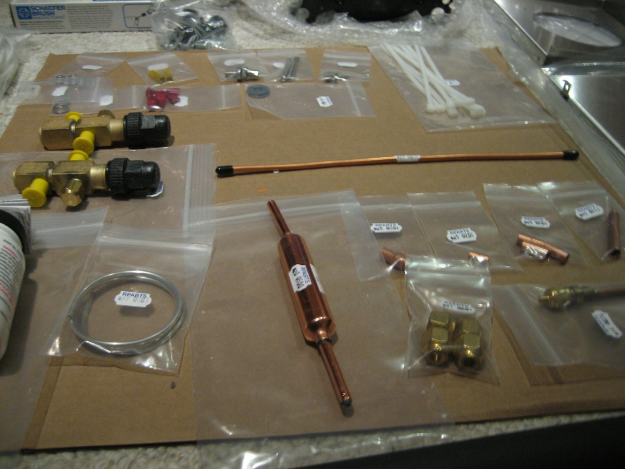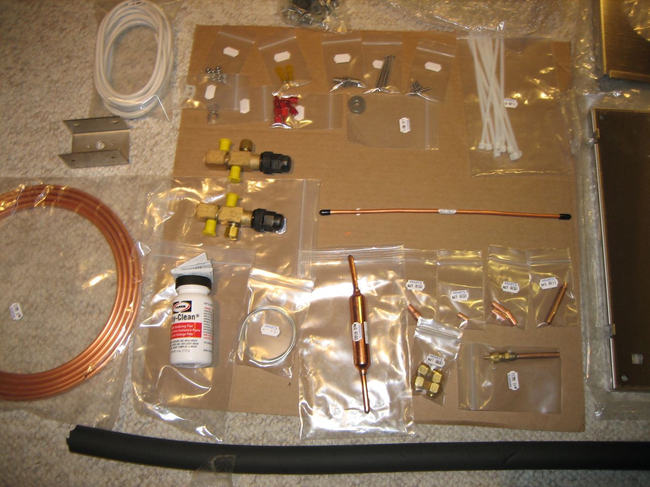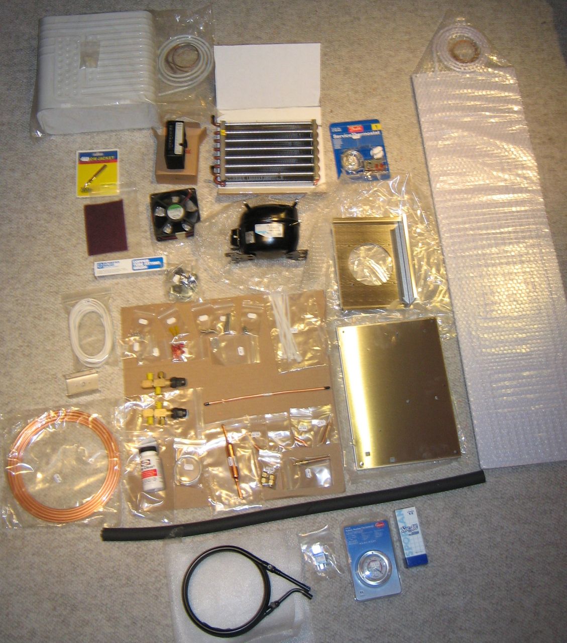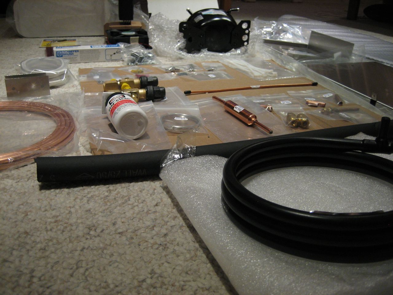 It all arrived today. It felt sort of like christmas, unpacking the boxes and discovering all of the parts. I took photos of all the stuff spread out on the floor. Below the black foam tubing are the extra parts beyond the 1M kit (and the white flat plate evaporator on the right).