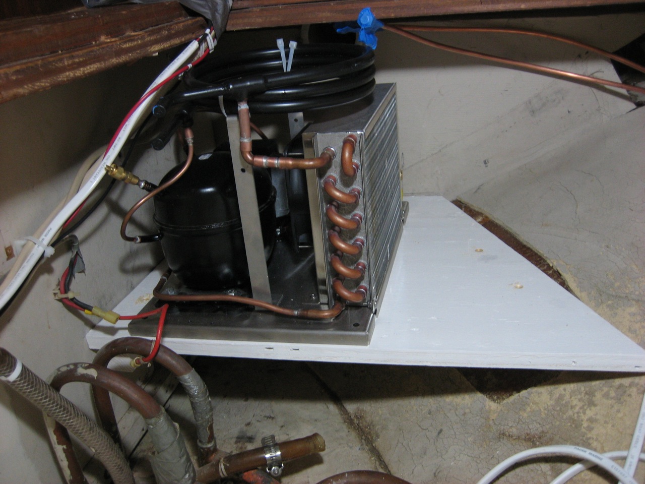 I checked out rparts, looked at their do-it-yourself kits, looked at the list of parts contained in the kits, looked at the price ($800), and decided that maybe I would learn how to do refrigeration after all. So I downloaded the installation manual for the 1M kit they sell, and using the manual and the rparts website and Kollman’s forum I sat down with Calder’s refrigeration book (which I had already read twice, without much illumination) and figured it all out finally. With the right combination of resources, each section of Calder’s book was now like a lightbulb going on. It was gratifying to finally understand an area which had previously seemed so baffling to me. I am extremely indebted to Marcus for inadvertantly convincing me to learn it and do it myself. “Do it ourselves” is our modus operandi for everything else on the boat, and it was out of character for me to want to simply pay money for a setup and not have to think about it or understand it or put in ridiculous amounts of time and labor for its installation.