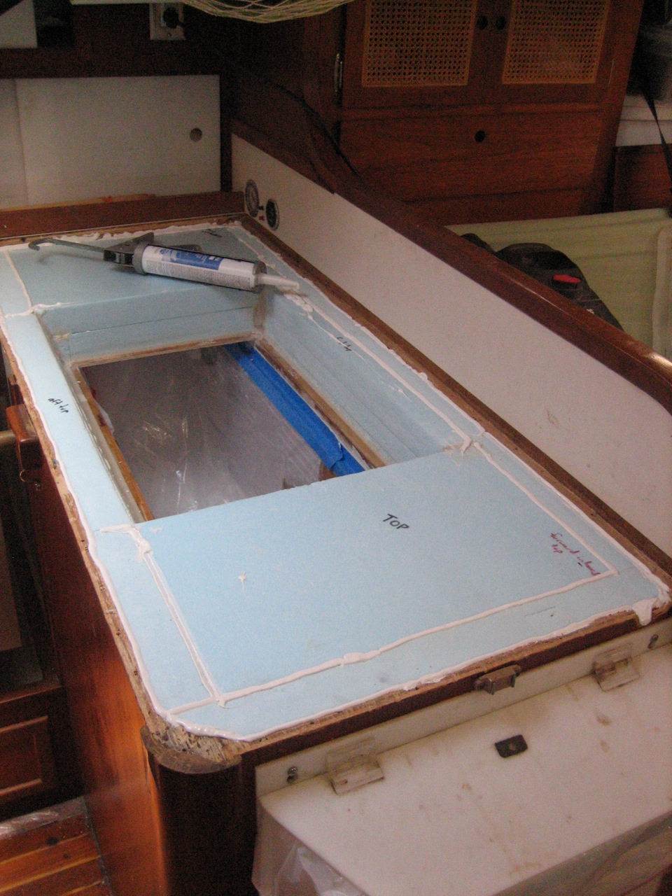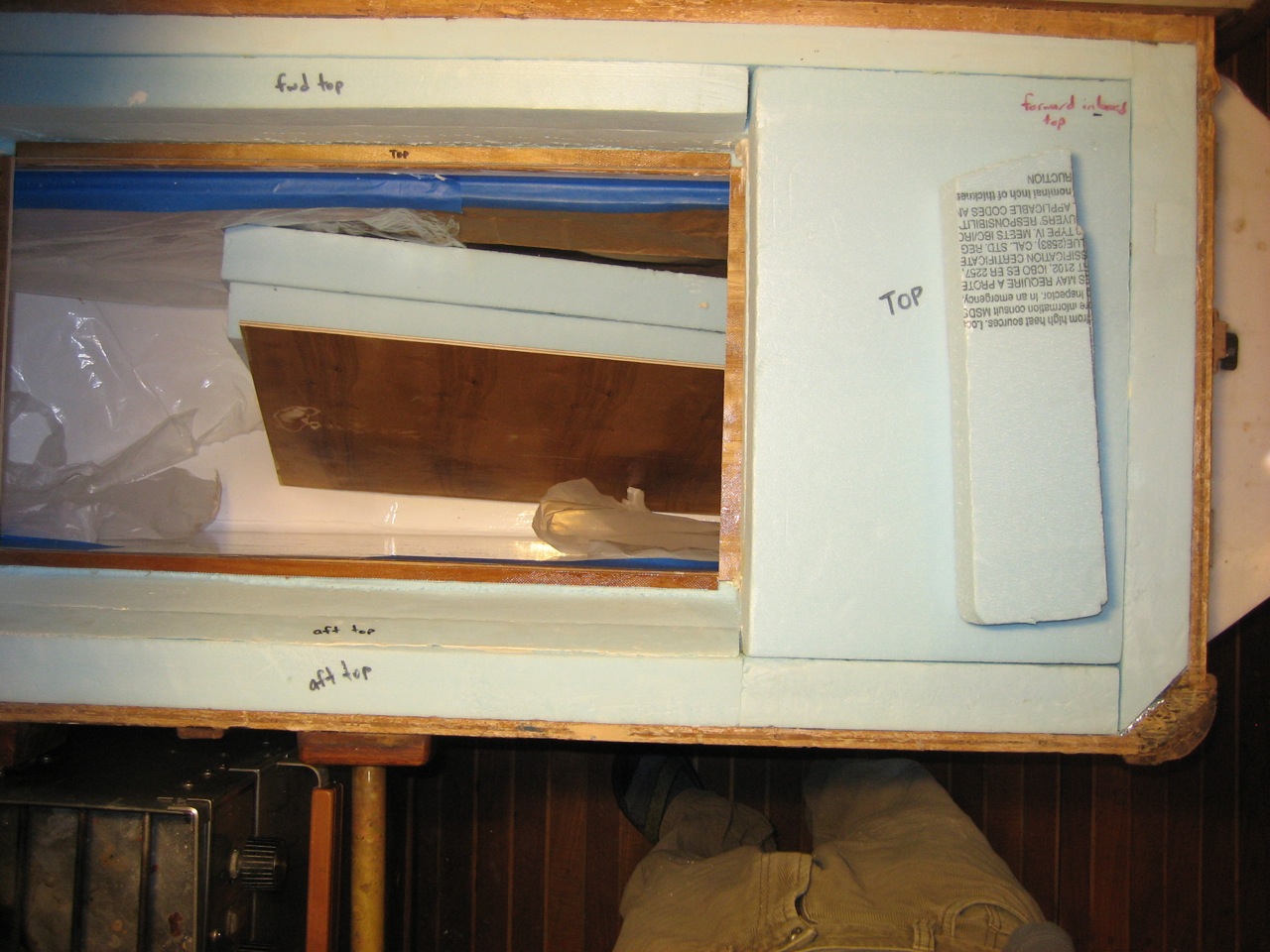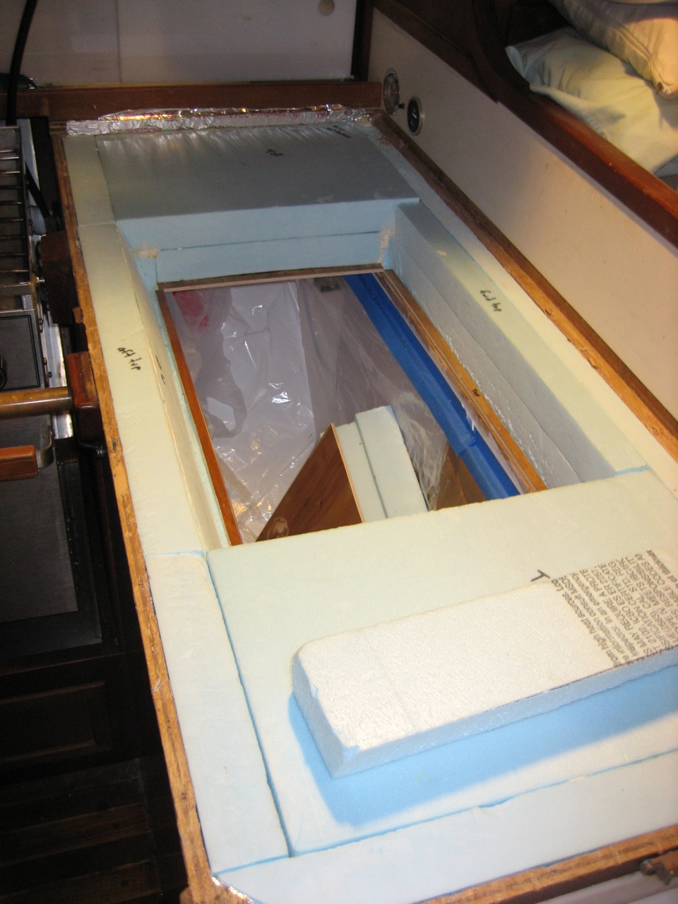 Jonny and I ripped out the old box in one day–the entire thing. The next day I picked up 18 sheets of 2’x4′ Blueboard 2″ thick from Pacific Supply. We lined the inside with a layer of aluminum foil, used spray adhesive to stick it in place. I taped the seams with metal tape. Then we made a huge mess cutting up the foam with the Dozuki saw–pretty easy and quick actually–and pieced most of the insulation in place. We bought two thin sheets of plywood and glassed over them with a few layers of fiberglass, then faired them smooth with quikfair, cut them to fit, and built a box inside the insulation. Jonny glued all the edges together with fillets of thickened epoxy, then we sanded them fair, and painted the inside of the box with two layers of Primekote, an epoxy primer.