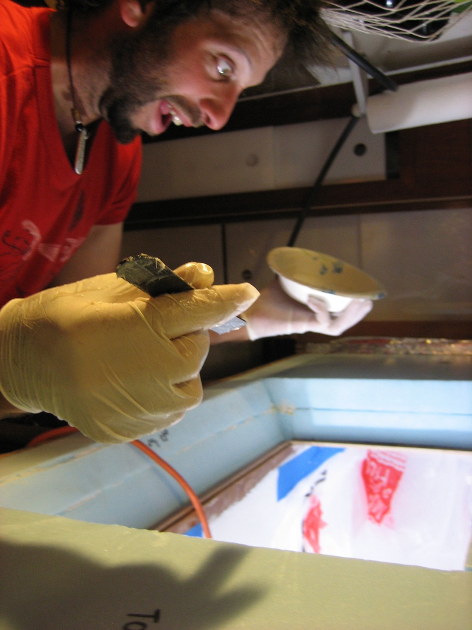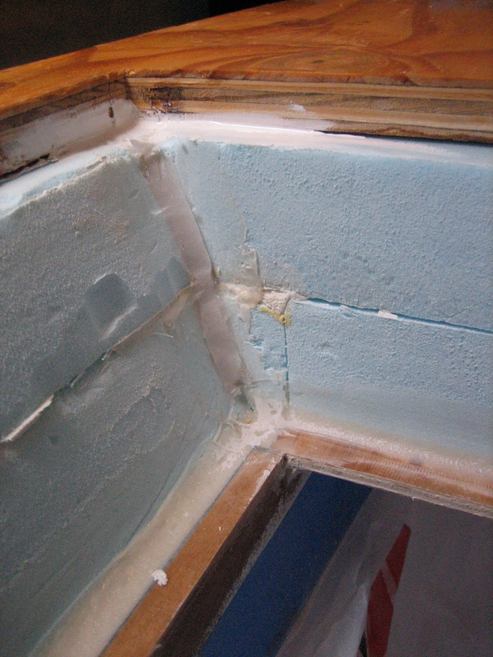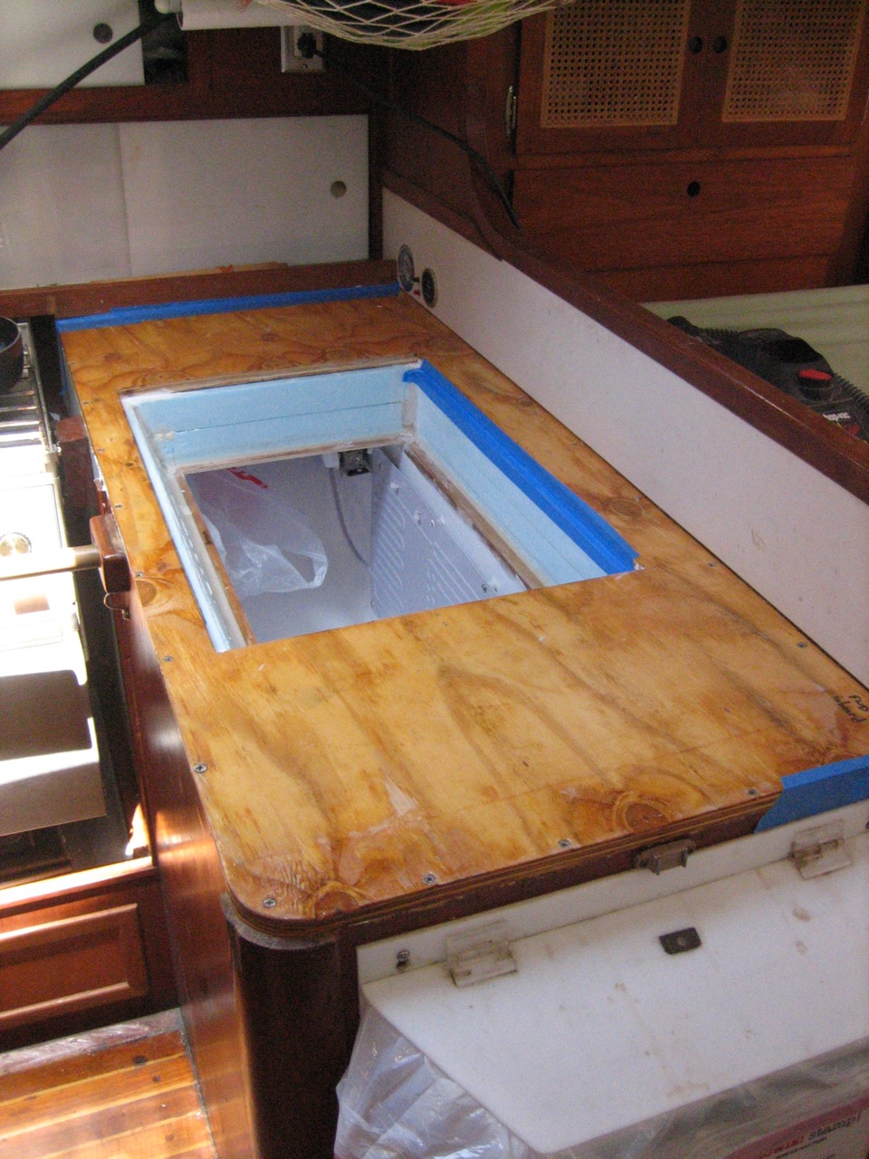 Jonny and I ripped out the old box in one day–the entire thing. The next day I picked up 18 sheets of 2’x4′ Blueboard 2″ thick from Pacific Supply. We lined the inside with a layer of aluminum foil, used spray adhesive to stick it in place. I taped the seams with metal tape. Then we made a huge mess cutting up the foam with the Dozuki saw–pretty easy and quick actually–and pieced most of the insulation in place. We bought two thin sheets of plywood and glassed over them with a few layers of fiberglass, then faired them smooth with quikfair, cut them to fit, and built a box inside the insulation. Jonny glued all the edges together with fillets of thickened epoxy, then we sanded them fair, and painted the inside of the box with two layers of Primekote, an epoxy primer.