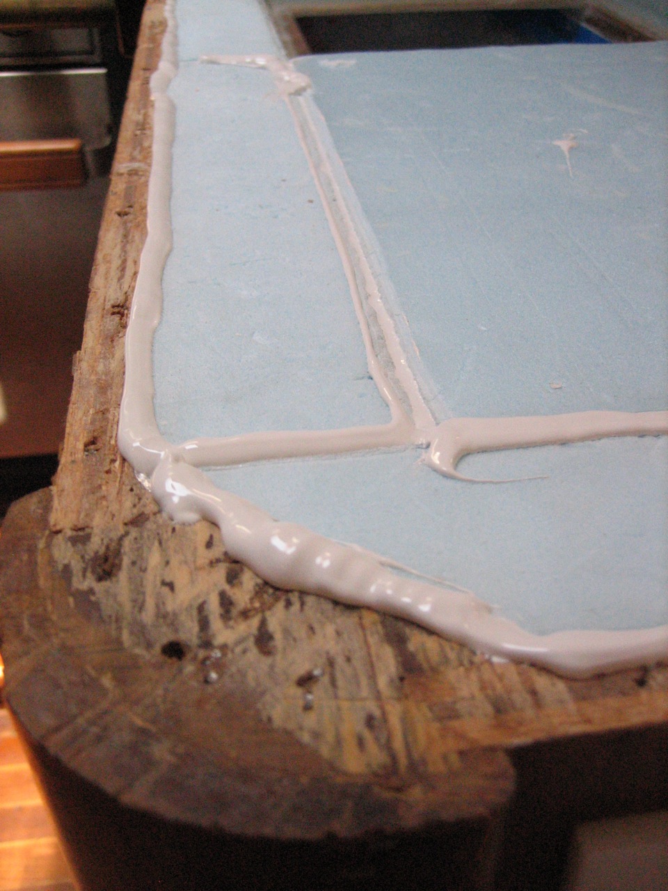 In April I started tackling it. I drew up detailed plans for the box and a list of steps, so that we could move as efficiently as possible once we started. I decided on 4″ all around of Blueboard–an extruded polystyrene made by Dow–for our insulation. Blueboard doesn’t have the highest R value of all the insulations available, but it is the most impervious to moisture and that means that after just a year or two it might be outperforming your other choices (lots of people use polyisocyanurate foam–commonly available at home depot, it looks like yellow foam with a foil backing–it absorbs moisture pretty readily!). The only place within 50 miles that sells the blueboard is Pacific Supply in South San Francisco, and the Dow representative I talked to told me that their west coast machine only makes boards 2′ wide. The design of the lid is the hardest part. You want it to ideally have the following features: double gaskets (top lip and bottom lip), flush mounted in the counter, minimal gap all around, angled front surface so it will open without jamming, easy to clean pretty finished surface. Since you build the box from the bottom up, it can be tricky to get the interior of the box and the countertop to be perfectly spaced for the exact thickness lid, etc. There are many ways of building it–the easiest is to buy a premade one for ~$500, from Glacier Bay for example.