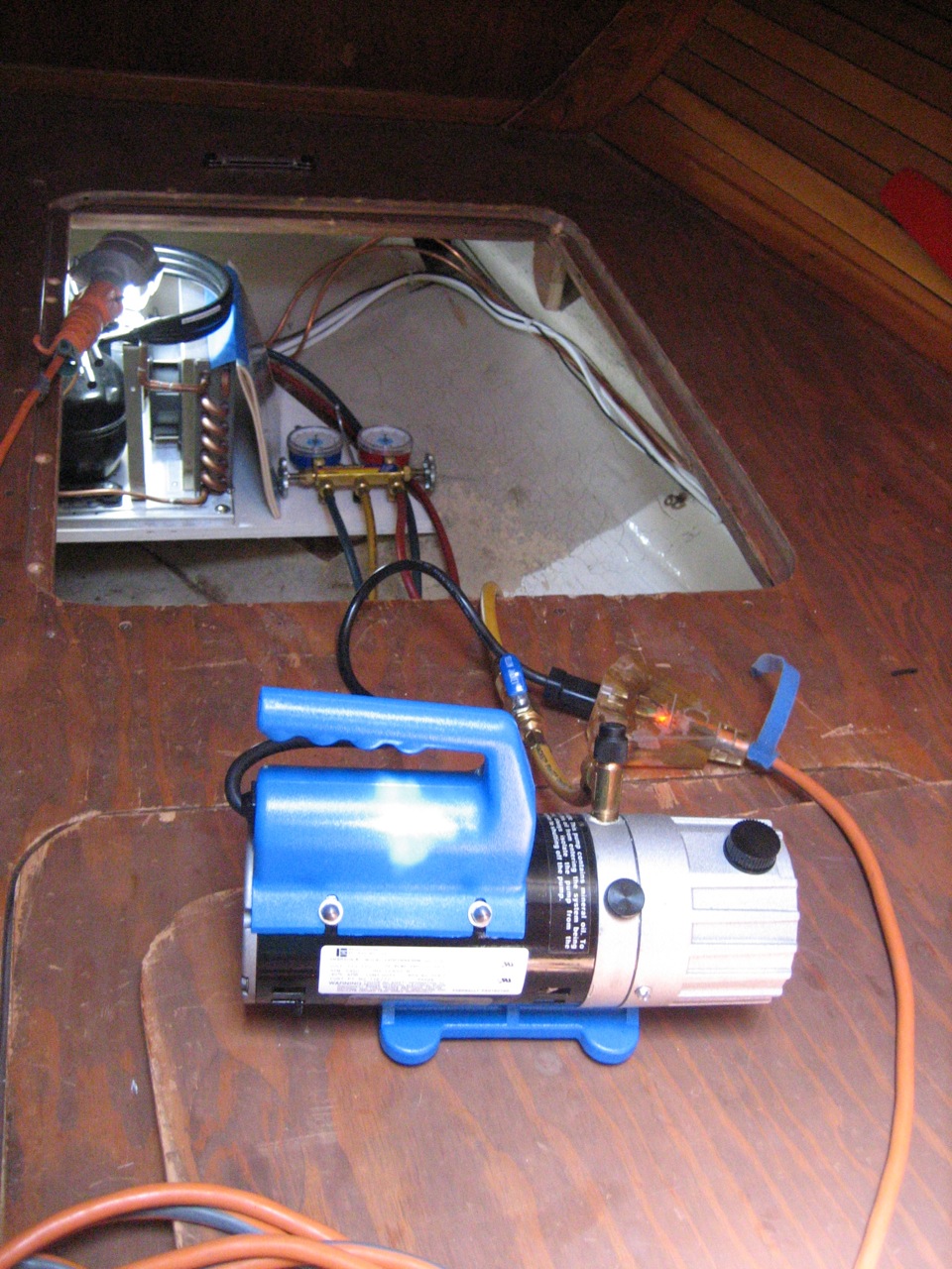 Initially I knew nothing about how the refrigeration system worked, and I decided to buy an Adler-Barbour Cold Machine and evaporator plate, which come precharged with refrigerant and ready to go, and just hook them up and be done with it. The total cost would be about $1300, and it could be installed in a day. I was all ready to buy it when I ran into Marcus on the dock and stopped by to check out his new system. Marcus was also in the process of rebuilding his whole refrigeration setup, including reinsulating (with vacuum panels!) two iceboxes, and building two compressor setups from parts himself. He purchased all the specialized refrigeration tools necessary to do the work himself, including a vacuum pump. Talking to him I was daunted by the amount of work and complication it represented, and in my mind I was still saying to myself “hell with that! I’m buying the adler-barbour!” But Marcus suggested that I take a look at a website called rparts to at least see if there was a cheaper option for me.