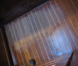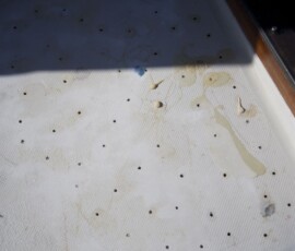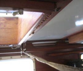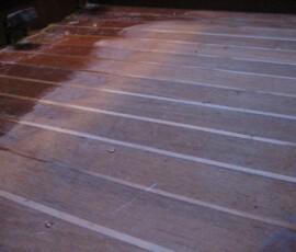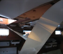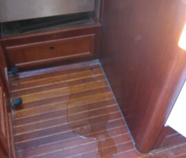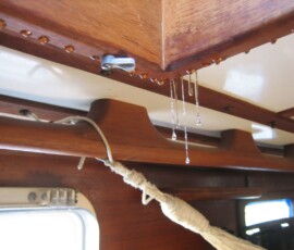 The next day I showed up at the boat to discover a cured puddle of resin covering the galley sole, and stalagtites of resin around the hatch above the puddle. I spent an hour and a half grinding the resin off the floor with the belt sander (36 grit) and another hour and a half chiseling apart the ceiling trim and panels. Now the floor of our galley has a large spot of ugly bare wood that I need to polyurethane, and I still haven’t successfully fixed the delamination on the deck. That sucked.