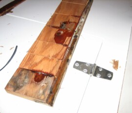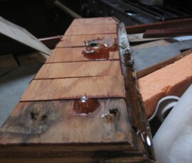 Since we are currently refinishing the deck, it is time to take care of it now. I learned about Merritt Supply and bought all necessary reparation equipment. I took the hammer around and tapped in a few other spots and found more delamination (big surprise–go looking for a problem on a boat and you are bound to find it). I took a pencil and the hammer and circled the area that was sounding hollow. Then I selected a drill bit sized to the syringe that I have for injecting the epoxy, and I drilled a number of holes all over the place in the area. Then Karen and I mixed up bowl after bowl of epoxy and injected it into the area. Karen jumped down below to make sure it wasn’t finding a way into the boat, and saw nothing.