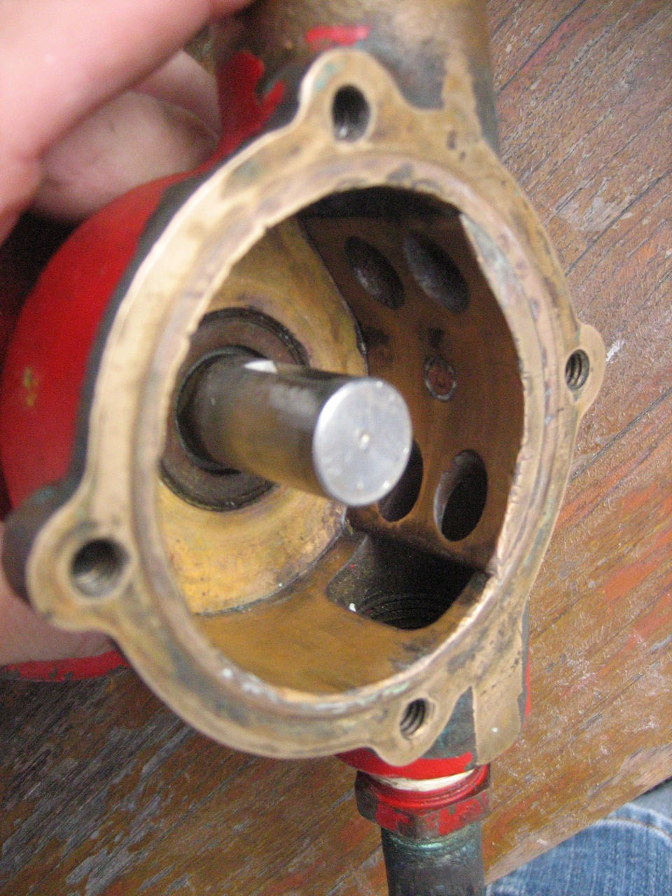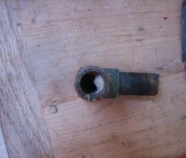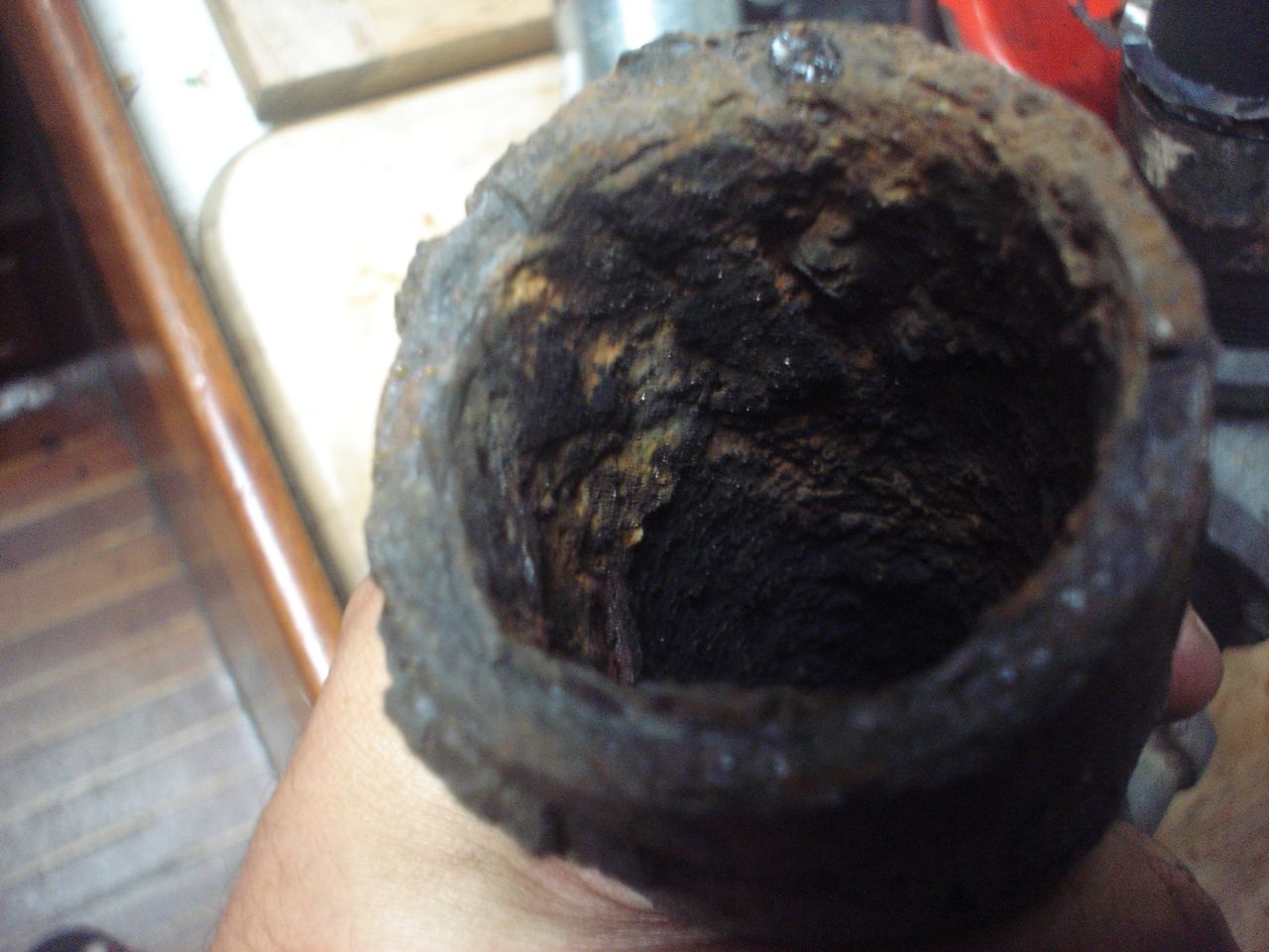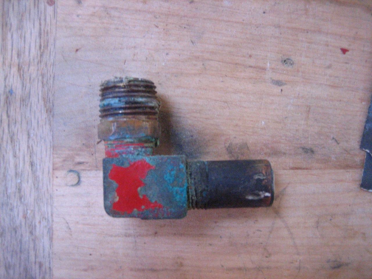 The fuel line from the injector pump to the injector was obviously getting stressed with all the torquing. So eventually I had to take the injector line off at the fuel injector. This also involved taking the fuel return line off and pulling out the injector from the engine with fuel line still dangling on it. With the line and injector off the engine and sitting nicely on a cutting board I was able to attach a vice grip and a wrench, add a pipe to each handle to lengthen the leverage and yard with all my might on the injector nut. It finally loosened. I screamed in satisfaction.