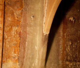 On the starboard side the cabinet didn’t come out so easily: I ended up breaking it a little in the process. On immediate inspection, both of these knees showed a small gap and cracking between the bottom point and the hull, indicating that they had indeed parted from the hull somewhat. After chiseling off the old kerfs (those vertical pieces of wood on either side of the knees, to which the horizontal trim battens were nailed) I was able to see that they used entirely too little tabbing to secure the knee to the hull. In the process of grinding off the old, bad stuff, I discovered that at the lowest level the tabbing had delaminated from the hull along its entire length, so I ended up having to grind off all of the old tabbing from the hull (I wasn’t that bad on the port side). I was in the bunny suit with the respirator and ear plugs and safety glasses and full face shield over that for 6 straight hours grinding away–it was a very unpleasant day. By the time I was done I had created a 1/4″ of fiberglass “snow” over every single surface inside my bubble (as karen called it).