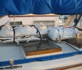 The dinghy is large heavy and unwieldy, and we had no place to put it except the floor of the cabin. We wanted to put it on deck. Turned out the most efficient use of space was to move the liferaft cradle aft, just forward of the dodger, then install steel tubing for the dinghy in front of that. The hardest part of the whole project was gaining access to the underside of the holes, inside the cabin. It was a pain in the ass to remove all the necessary ceiling panels, pull out the foam, cut out squares in plywood where necessary, and in one spot even relocating some wiring to make space for the bolts to come through. For every hole we cored out the deck, filled with a plug of thickened epoxy, and redrilled the holes down through the center. When we put it all together we used lifecaulk as our sealant. Jonny built the new dinghy cradle out of 316 stainless tubing and fittings (a shout out to Marcus, a marina friend, for helping source the expensive stainless). The result looks really sharp and is completely bombproof. We found a location for all of the mounts that doesn’t foul the running rigging (which all runs directly under both the liferaft and the dinghy). We made the dinghy cradle wide and long enough so that it was easy use simple webbing cam straps to hold it down.