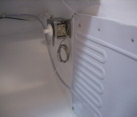 The icebox has stayed 32-38 for the past three weeks, so it’s working well. We have been having some issues with the compressor short-cycling (coming on for two minutes, going off for three, back on, etc). The situation started to worry me when we started getting the intermittent fault code of three red blinks: indicating “rotor blocked or pressure differential too high”. I speculate that the compressor was trying to turn on again too quickly–before the pressure differential had sufficient time to equalize through the evaporator plate. My research on kollman’s forum and the rparts forum tells me that the short-cycling is a result of too much of the thermostat sensor touching the evaporator plate. I have pulled all but an inch of the sensor tubing off of the plate, coiled up a few inches away from it. It seems to be working better, but I haven’t got a trustworthy data set yet to be sure. Aside from that, the box is totally finished: