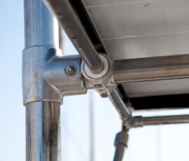 So I welded the supports to the vertical pole, but I decided that I wanted to use fittings to mount the rest of the supports in place–I wanted them to be adjustable and removable if necessary. I went with “speedrail” fittings for the pipe, then had TAP plastics fabricated some starboard bushings to mate our leftover 1″ stainless tube into the pipe fittings (I couldn’t find any commercially available adaptors, anywhere). Our old bimini frame (1″ stainless tube) had been hanging off the bow for months; I cut almost all the pieces I needed for the solar panel frame out of the old bimini apparatus.