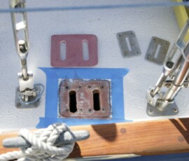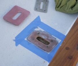 Jim Hassberger from Kanga suggested that we add plinths to the deck, through which the chainplates protrude, in order to prevent the plates from ever sitting in water. At first I didn’t want to do the extra work, but good sense prevailed and we took the extra time to do it. Jon cut rectangles from a leftover piece of 3/8″ thick FRP (pre-made sheet of fiberglass) from McMaster-Carr that we had used in the construction of the lazarette and propane locker lids. He ground a bevel into each side, then I cut an overlarge slot down through the center to admit the plates. I temporarily mounted the chainplates (two bolts each loosely connected), then marked the position of the plinths. Then I removed the chainplates and glassed the plinths to the deck with slightly thickened epoxy (after having sanded down the area under them to bare glass).