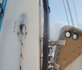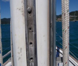 When starting to sail away from Lady Musgrave Island in heavy winds, I raised the main sail to the 2nd reef and began tightening on the 2nd reef clew line. I then tightened up the vang as the boom seemed unusually high. Somehow something that I did, in combination with the heavy winds, caused about 8 rivets to pop out from the mast. These rivets held in the metal track which holds the plastic sleeve the main sail slides up and down on.