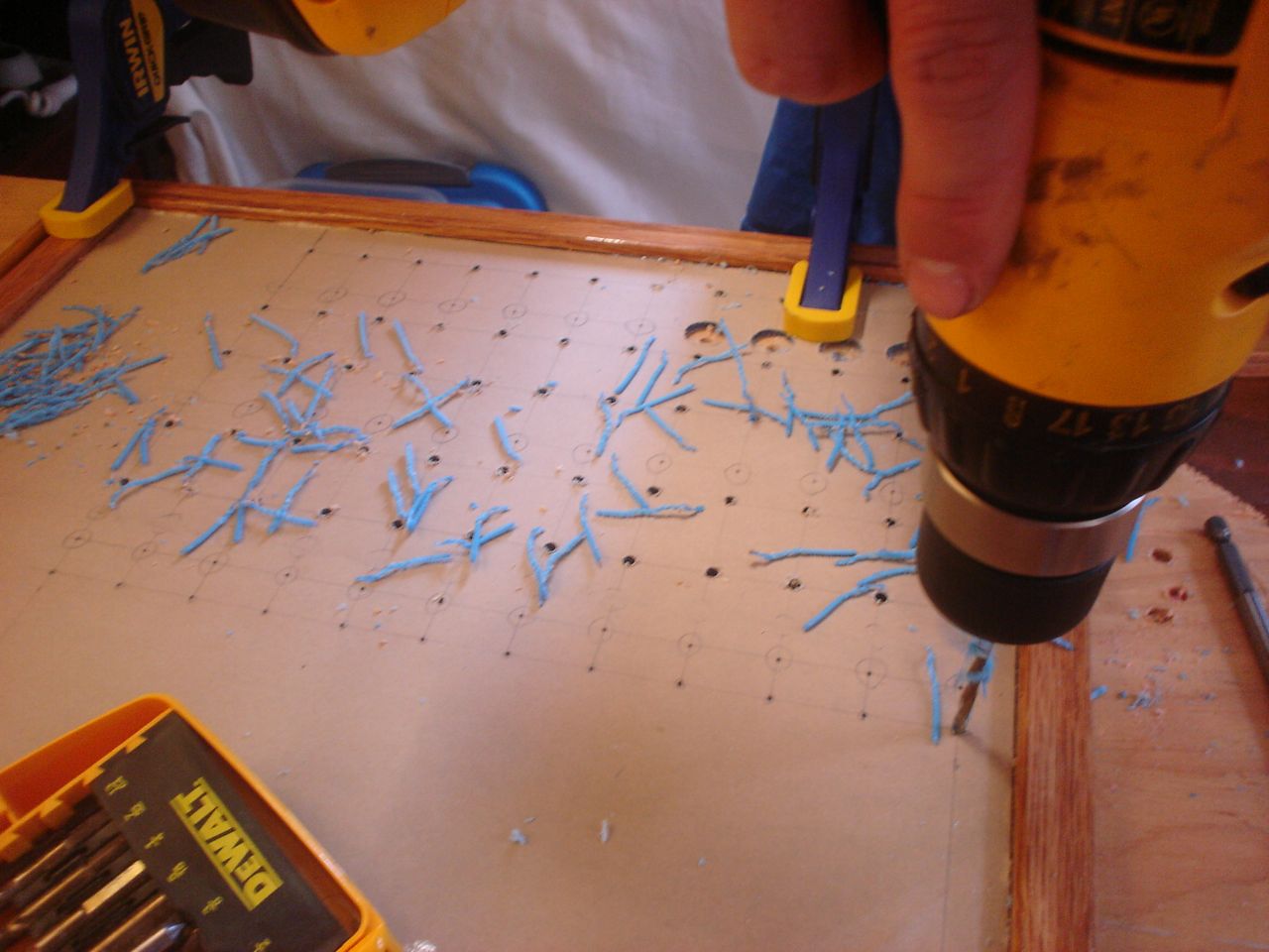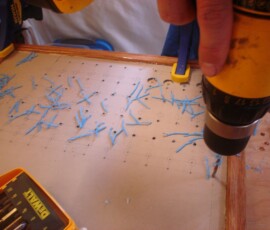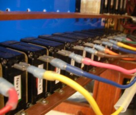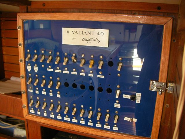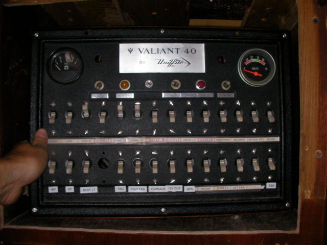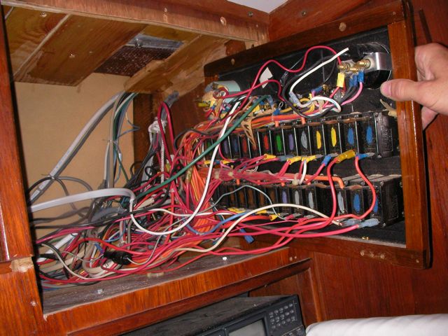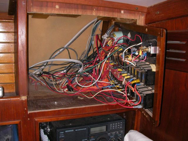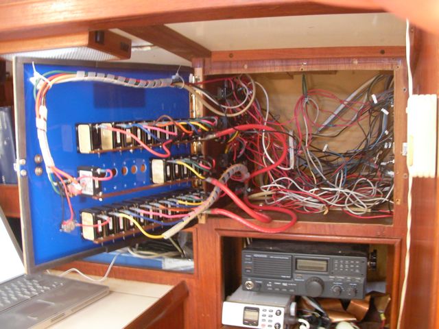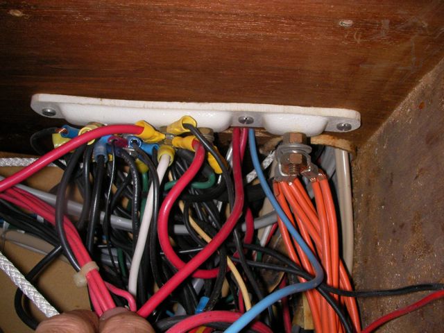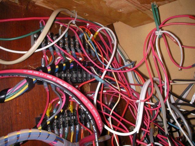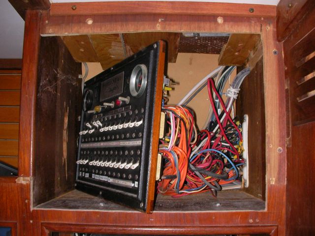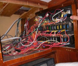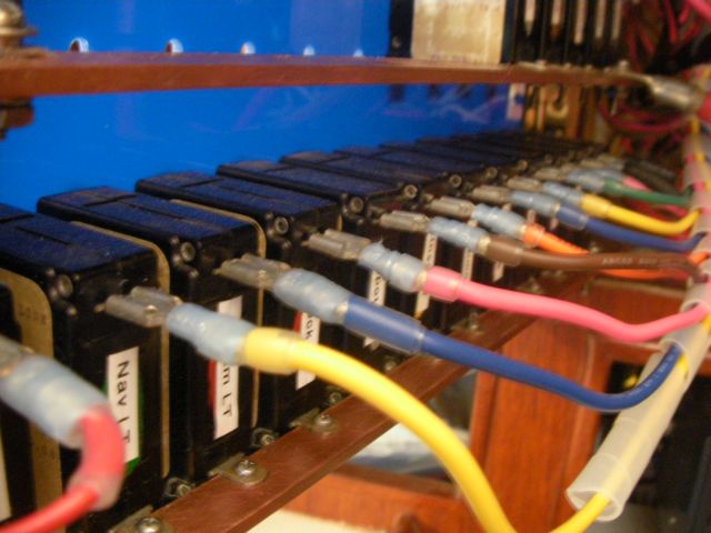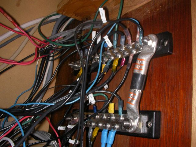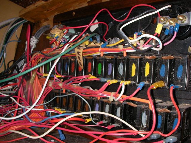 This was a hell of a job. First I’ll describe the original state of the panel. The panel was set back 4 inches in the space, behind a 3 inch vertical piece of trim. The panel was hinged at the bottom, so that when it folds down it hits the piece of trim, preventing it from opening less than halfway. Inside the panel, all of the negative wiring was piled up on a single stud, with over 16 terminals stacked on top of each other, all corroding. A handful of wires had pulled out of the terminals and were hanging loose in the compartment, only a few inches away from the hot stud. It was unorganized, impossible to access and work on it, and a serious fire hazard. I took out the old panel and cut out the trim so that the new panel could be mounted at the face of the compartment (rather than 4″ recessed). I constructed a new panel out of plexiglass from TAP plastics, laboriously drilling all the holes to accomodate the circuit breakers. I put a piece of hardwood trip around the outside (coated with penetrating epoxy) and used a long piano hinge to mount it. I used all of the old breakers from the old panel. To make the common, hot side of the circuit breakers, I bought a strip of solid copper from McmasterCarr, and drilled out holes to match the location of the circuit breakers. I bought tiny little screws from bowline and screwed the common hot side of each breaker flat against the copper bus bar. I ran 0 gauge hot and negative cables to the compartment, mounting all the negative to the right and all the hot to the left. The 0 gauge hot supply runs to a stud, and 3-4 gauge jumper cables connect from this stud to each of the copper bus bars on the back of the panel (there are three rows of breakers). I mounted three terminal blocks on the left side of the compartment, to mirror the three rows of circuit breakers. I used short jumpers of 12 gauge wire in as many different colors as I could find to make the connections from the circuit breakers to the terminal blocks. These short jumpers are bundled into spiral wrap to tame them. All of the negative wiring runs to a dedicated spot (very few stacked terminals) on two ample sized negative bus bars. The wiring remains loose in the compartment behind the panel, and looks completely disorganized. But there’s plenty of space and it is simple to trace wiring. I am concerned that if I bundle the wiring all up to make it look pretty, it will only make it more difficult to trace wiring.