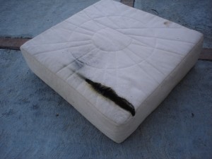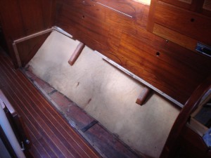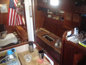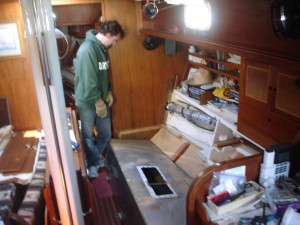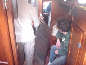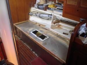 Our idea is to replace the stainless tanks with our own home-built West System plywood/epoxy tanks. We have 150gallons of tankage; if we had less I would have elected to use Ronco plastic tanks, but they don’t make ones near big enough and I didn’t want complicated plumbing stringing multiple tanks together. The watertanks are bolted to the hull in two places on the backside of the tank (each one), via a machine screw to fiberglass stringers. The tanks were installed in the boat and the settees and storage were built around them, so it is necessary to cut out access hatches through the bottom of the storage compartments behind the settee. We determined where to cut these access hatches by using a mirror and a yardstick to estimate the location of each stringer. I really really hate having to cut new holes in the boat, but in this case it truly was unavoidable. The tanks are not identically sized; the starboard tank is slightly smaller. We were able to take the starboard tank out the companionway–it was a very tight fit. After that sigh of relief, we were extremely dismayed to discover that the port tank is larger and definitely doesn’t fit. We went back and forth trying to decide whether we should tear about the companionway trim or cut up the tank. We weren’t sure we’d be able to get the tank out even if we ripped out all the trim, so we elected to cut the tank up down below. This proved to be an epic task, and that’s an understatement.