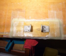 An earlier post describes the laborious task of removing the old tanks from the boat. We decided to make our own tanks out of plywood and epoxy–we figured this was the only way we could preserve the volume available to us under the settee, since the tank is such a funky shape. I had come up with this idea from some book, and found more information about it in a special bulletin from West System (they cannot, however, recommend it for drinking water storage, for obvious liability reasons). Jon and Jonny did all of the construction on the tanks, and unfortunately it required one full week of labor, all day every day, just to make the tanks. It took much more time to fit them into their spaces, construct brackets to mount them, mount the lids and seal them properly, etc. We used 3/8″ marine grade plywood. We epoxied a layer of fiberglass to all sides of all pieces of the plywood (including a baffle). We coated the outside surfaces with 3 layers of epoxy (“neat”; i.e. unthickened) and the inside with 5 layers of epoxy (all West System). We followed the instructions in the bulletin mentioned above for a slightly resin rich ratio, specifically 6 pumps of resin to 5 pumps of hardener. According to West System, it is the hardener that is the nastier stuff and that can affect the taste. After coating all the plywood pieces in this manner, the tanks were assembled with screws, leaving the lid off. Generous fillets of epoxy were applied to all seams to thoroughly seal the tank. Two holes were left in each lid for beckson ports. The tanks were brought below without the lids installed. The tricky part was making brackets that would actually fit when we went to bolt it all down–there’s not much room for error there, and there is almost zero access to the outboard brackets that are on stringers against the hull. Brackets consisting of two short aluminum angles (leftover mast steps–tumbled and anodized already) were glassed onto a small rectangle of plywood. This mounting bracket was loosely bolted to the stringer. We peanut buttered this rectangle with thickened epoxy and pushed the tank into place onto this mounting board. We did the same with the two inboard brackets at the floor. After it cured, we gently unbolted the brackets and removed the whole tank. We then glassed the shit out of the brackets before reinstalling the tank permanently in place. Finally, we epoxied the lid into place, reaching through the access holes to put the sealing fillet around the top seam (tedious and annoying step). Finally, we glued the beckson ports in place with 5200 (epoxy doesn’t stick to plastic). We used plastic plumbing fittings and mounted them in place with 5200.
