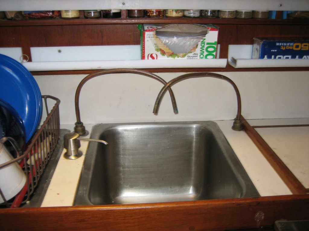 There is only one type of faucet that is available for use with manual water pumps, so far as I can tell. And that faucet was too short to extend into our sink in a convenient way–it barely hung over the edge, making it frustrating to wash pots, fill pots, etc. So we made our own out of pieces of copper tubing which was easy to bend, and painstakingly figured out a way to seal and mount it in the countertop in a way that would allow them to swivel. The result is not pretty, I’m not going to lie. But it is a big improvement in function, and seems to work perfectly well so far. We made one for both our fresh and salt water pumps.