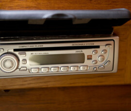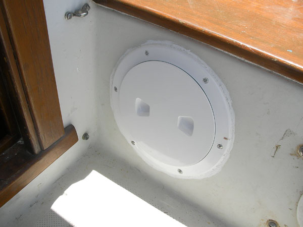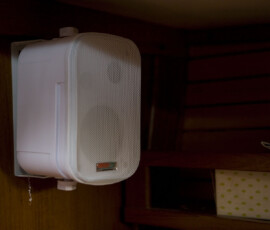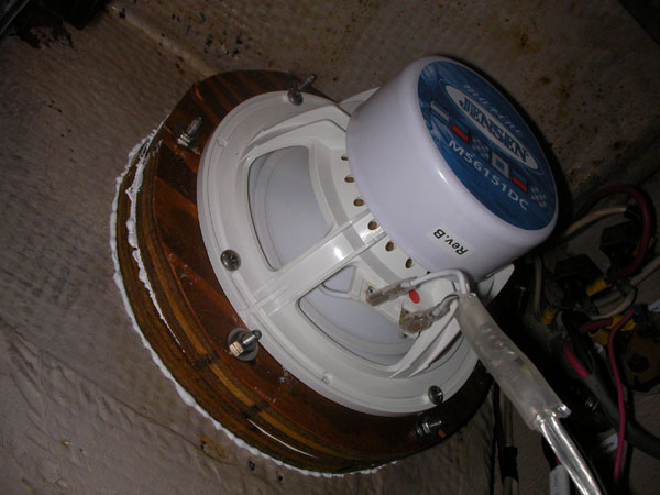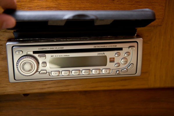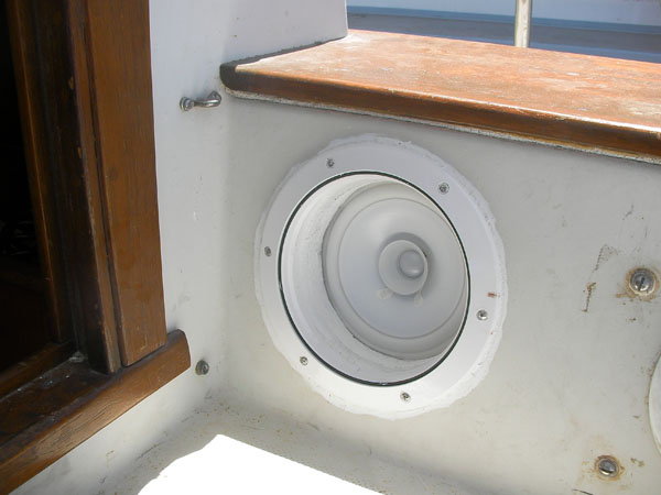The old speakers were blown out (two in cockpit, two in cabin) and the old stereo had no auxiliary input for the ipod/computer. After tolerating a noisy tape-adaptor system for four months we elected to spring for new stuff. We bought a bottom dollar “marine” stereo (only marine thing about it was a piece of plastic across the top of it, sealing off a couple screw holes), two 6.5″ speakers for the cockpit, and two mounted box-like speakers for the cabin. We ran fresh Ancor tinned marine-grade speaker wire for all of them. I did it by the book in splicing, soldering, and heat shrinking the dozen wires out the back of the stereo, and mounted a little beautiful 1/8″ headphone jack in the bulkhead for the ipod hookup.